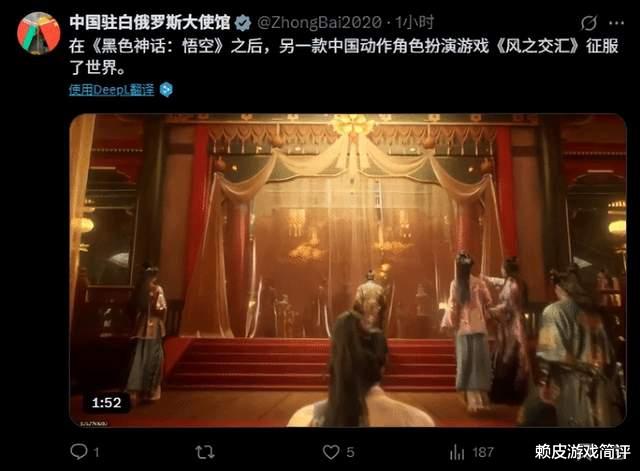 而在11月25日,因网易旗下的《燕云十六声》在Steam平台取得了良好的成绩,展现了中华文化产品在全球的吸引力,它获得了第十二任中国驻美国大使谢峰以及中国驻白俄罗斯大使馆的相继推荐,表示该作是“继《黑神话:悟空》之后,又一款征服世界的中国ARPG力作”。
