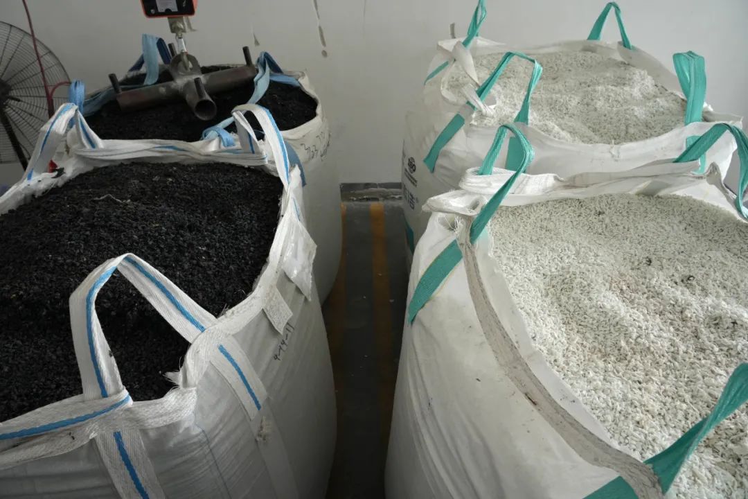 来自不同城市收购点的废旧衣物及纺织品边角料进入厂区后,先由工人手工进行初步拆解,其后再运入破碎机进一步碎化,最后输往升温达270摄氏度的团料机,将原料融成黑白两色的颗粒物。期间,为求成品品质符合市场要求,还会对半成品进行多级过滤。厂内的多级过滤系统处理杂质的精确度为15微米,能将相当于头发丝六分之一直径的无机物颗粒、金属杂质滤除。