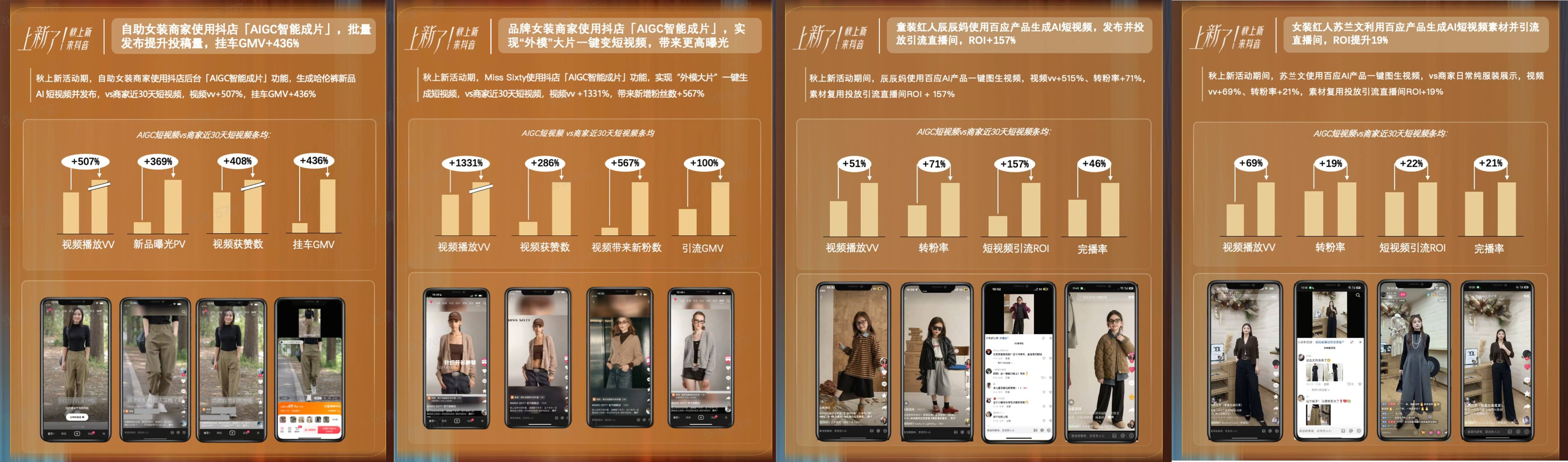 抖音商城「秋上新」还挖掘多个AI服务商,提供更个性化的AI制作服务,帮助商家批量生成优质素材。其中AI挂车短视频效率更好,日均播放量增长465%,日均GMV接近翻倍,关注次数增长606%。