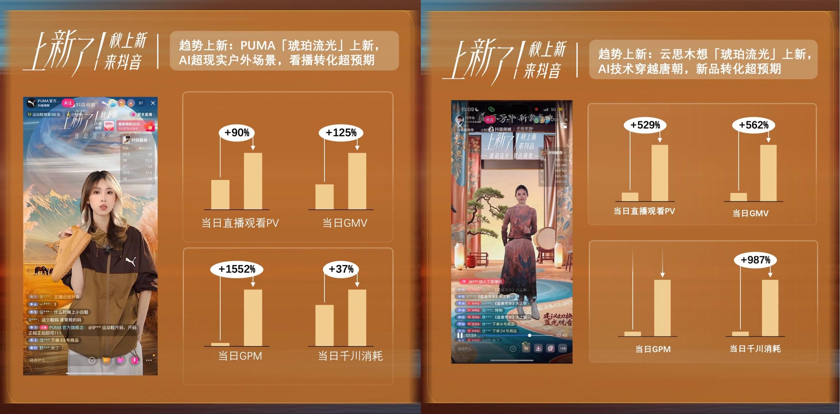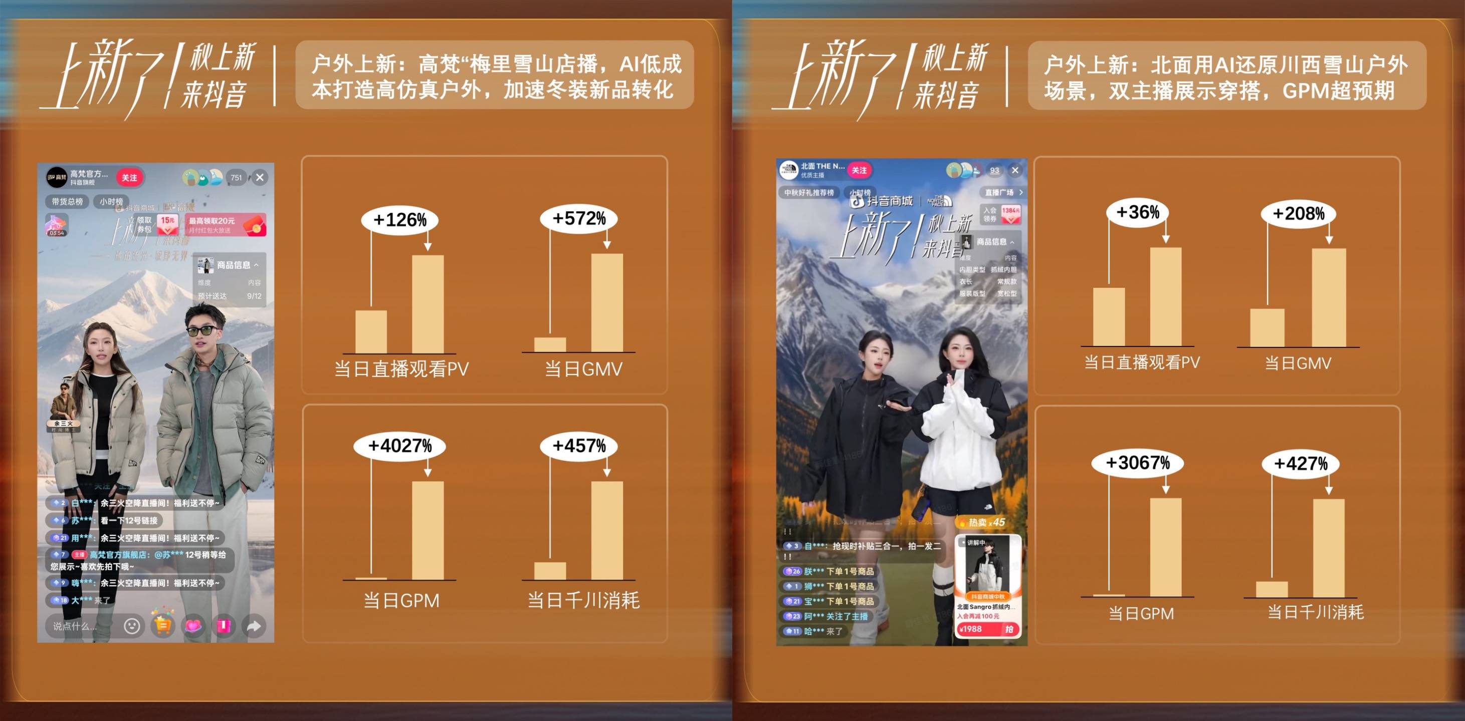 • 户外上新:AIGC助力低成本打造高仿真户外,多种户外场景直播呈现。高梵、北面分别在靠梅里雪山、川西雪山AI户外置景拉动GMV与GPM成本增长,加速冬装新品转化。