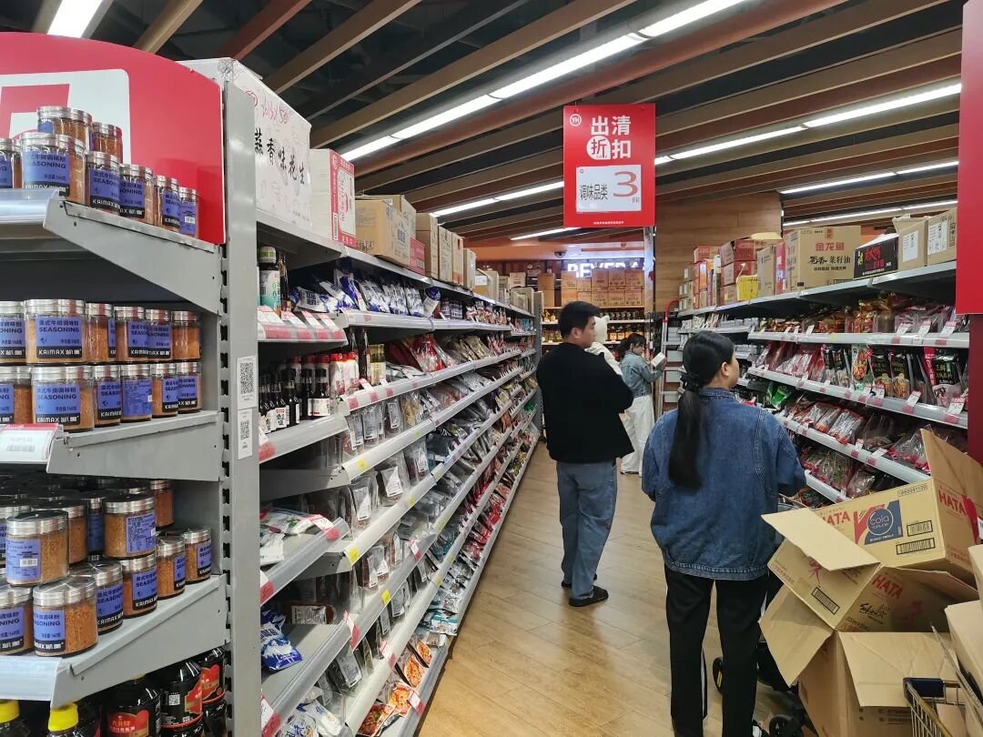 在调味区,“三折起”的红色促销牌悬挂在货柜上方,格外吸引目光。老抽、生抽、料酒等瓶装调味品整齐排列,鸡精、味精等干货类商品也满满当当,平日价格稳定的蚝油、豆瓣酱均贴上折扣标签。“趁现在便宜,把家里常用的调味都备足。”几位老街坊围在货架前,仔细比较不同品牌的酱油。
