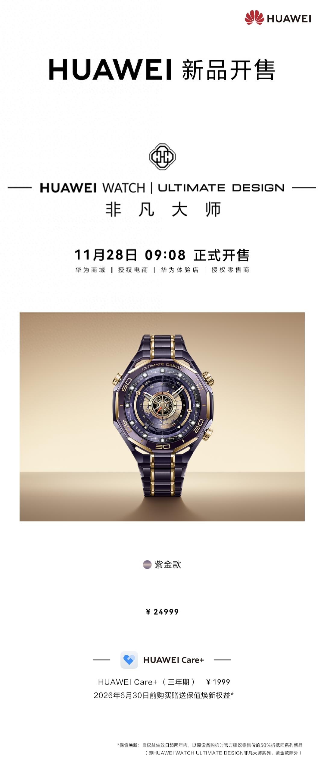 可随新机搭配购买HUAWEI Care+综合保障服务产品,为您提供3年2次意外保障及3年官方质保,并且还限时(2026年6月30日之前)赠送保值焕新权益,权益生效之日起两年内(生效之日起至第24个月底止),若原设备满足保值焕新回收标准,即可享受原设备在购买时的官方建议零售价的50%折抵优惠,购买HUAWEI WATCH ULTIMATE DESIGN同系列新机(不含本机,不含Ultimate非凡探索系列)。