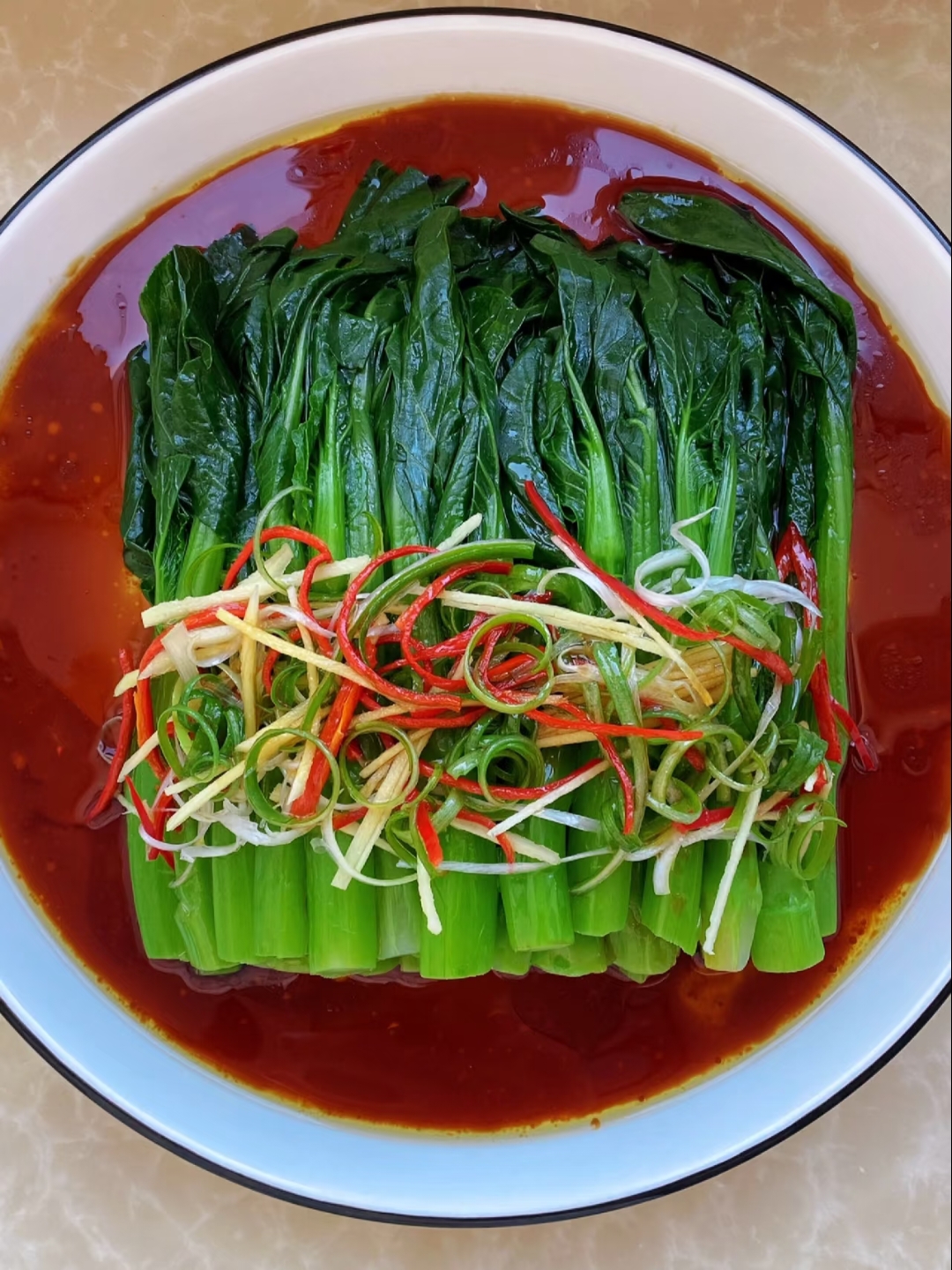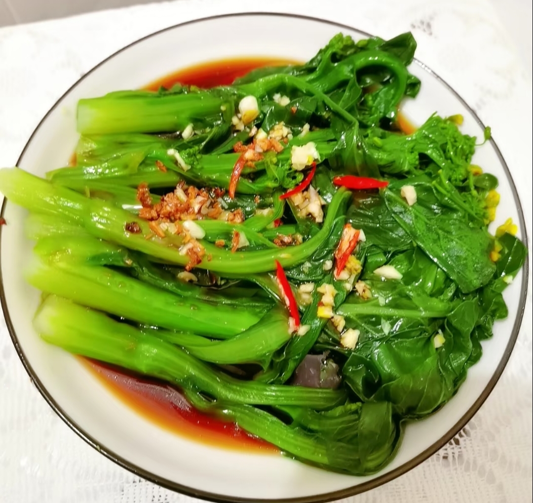 4. 淋油仪式:沥干水分的菜心整齐码盘,淋上琥珀色的酱汁。最后一道工序最是讲究,花生油烧至微微冒烟,沿着盘边缓缓浇下,金黄的油珠在翠绿菜叶上跳跃,瞬间激发出蒜香与酱香的双重奏鸣。