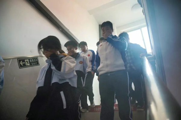 在楼梯口、转角处,疏散引导员全程值守,指挥学生不推不挤、礼让通行。烟雾弥漫中,师生们沉着冷静,迅速撤离至教学楼前安全区域。