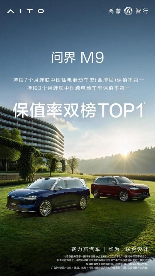 进入2026年,问界M9保值率依旧保持行业领先水平。在中国汽车流通协会最新发布的《2026年2月中国汽车保值率报告》中,问界M9荣获国产增程混动及纯电动车型保值率双榜第一,这已是问界M9连续7个月蝉联中国插电混动车型(含增程)保值率第一,连续3个月蝉联中国纯电动车型保值率第一。这一系列荣誉充分印证了问界M9作为科技旗舰的硬核实力,让中国高端新能源汽车在保值率这一核心市场维度上实现了全新突破。
