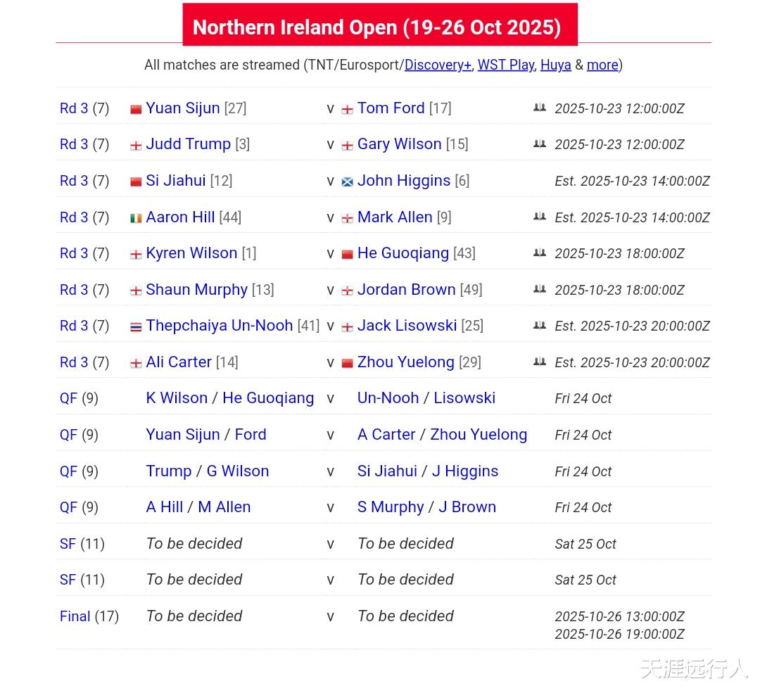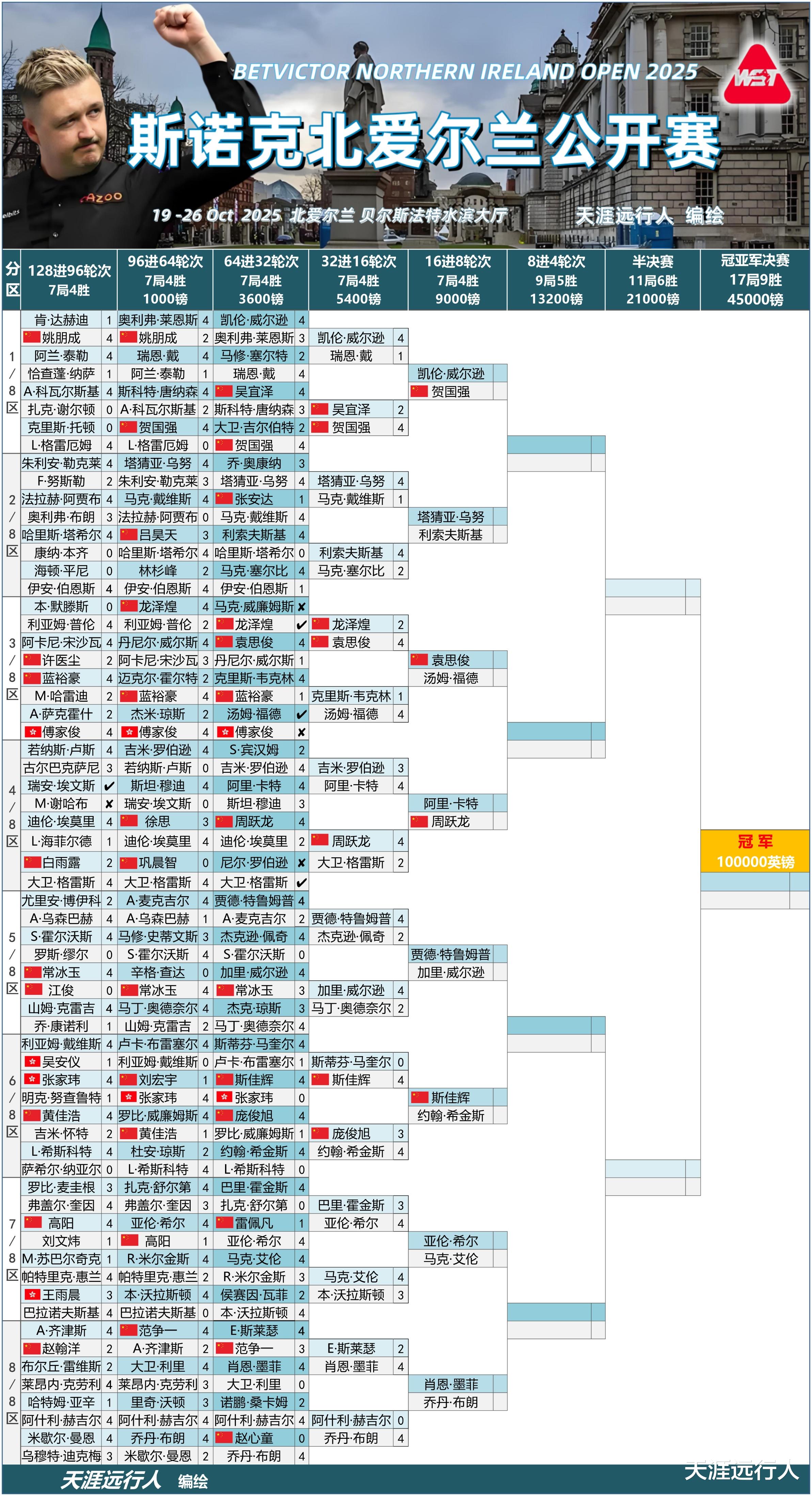 最新即时更新2025斯诺克北爱尔兰公开赛进程签表,一表看北爱赛全程,各位看官老师敬请转发收藏,以备不时之需