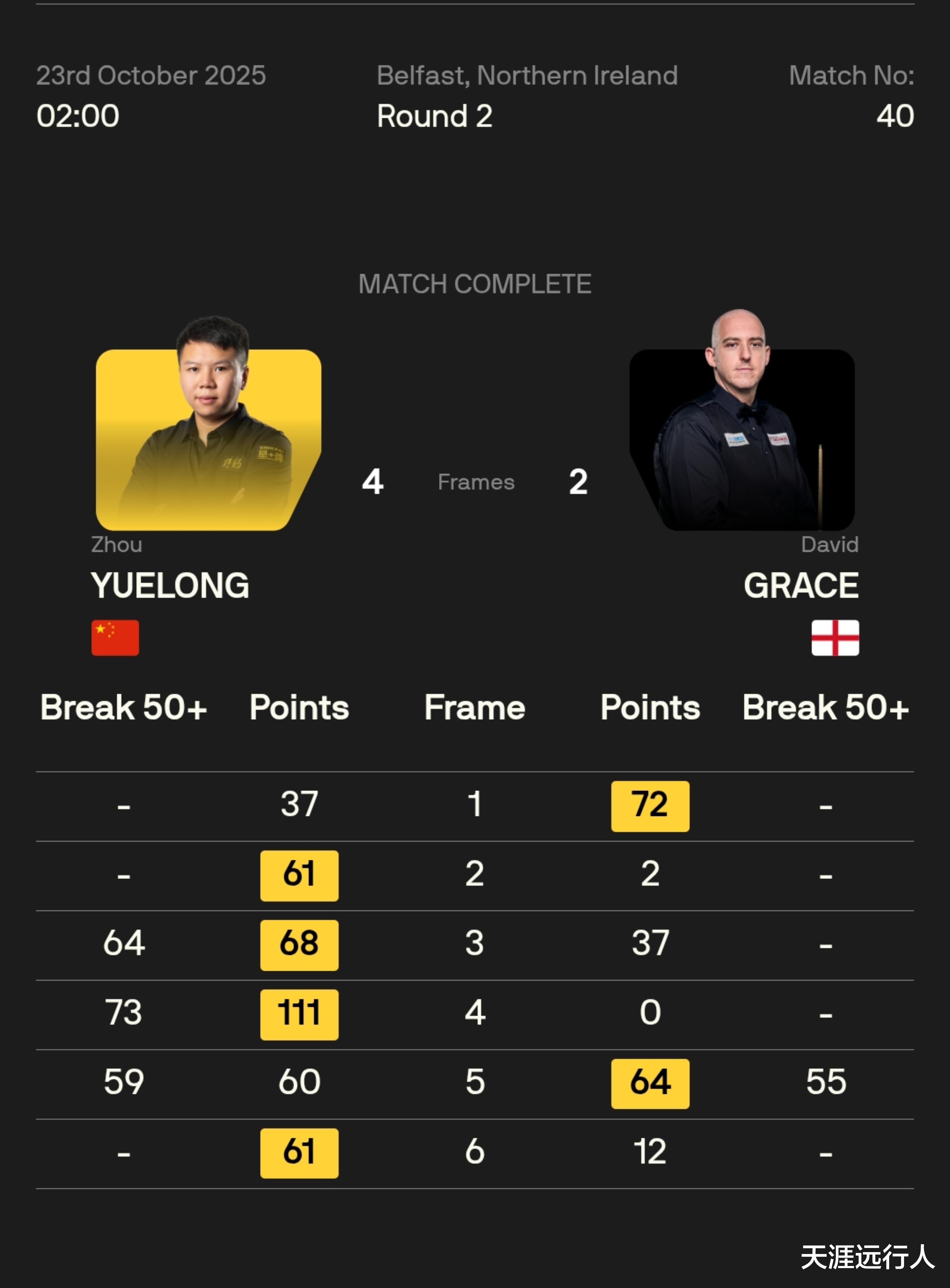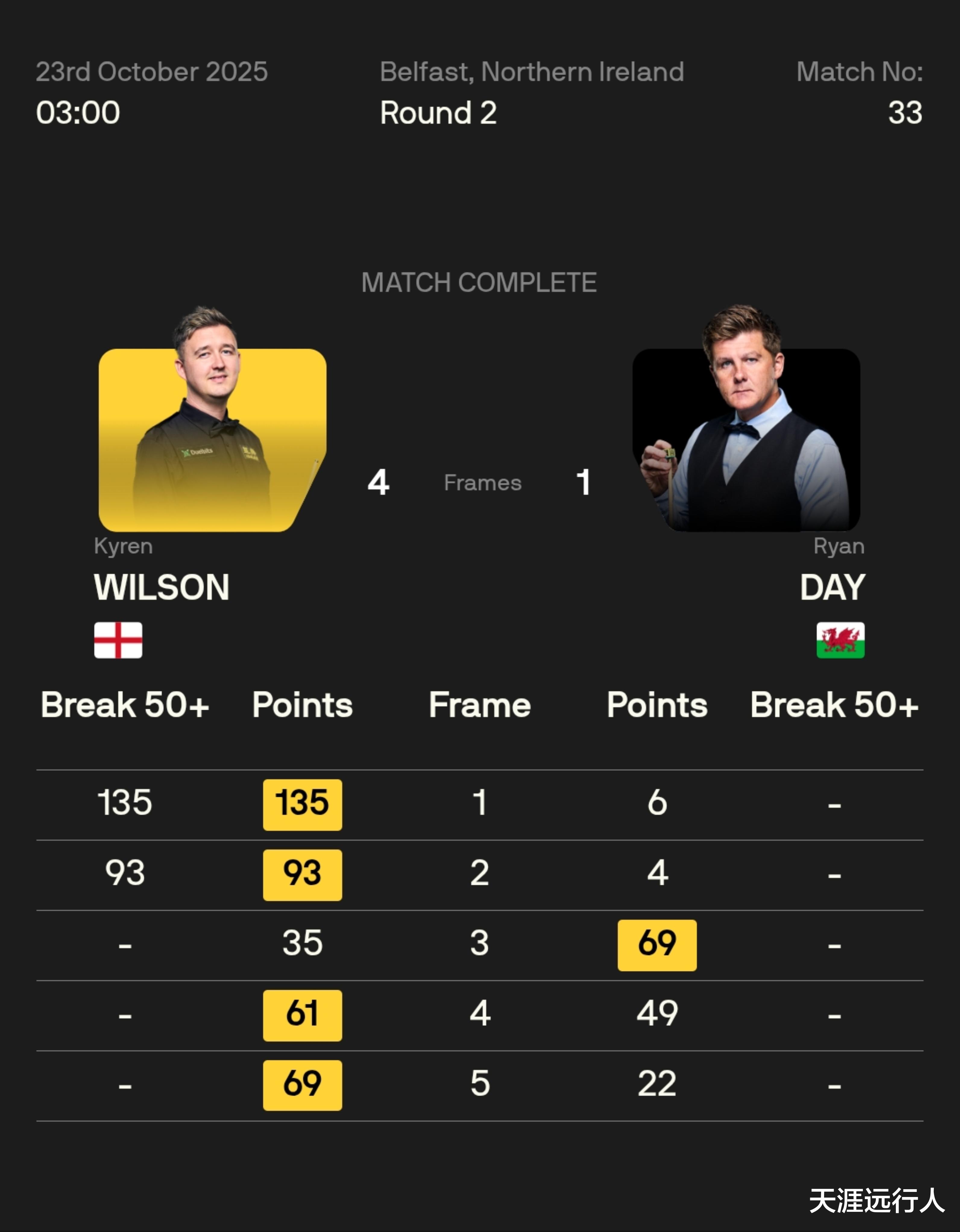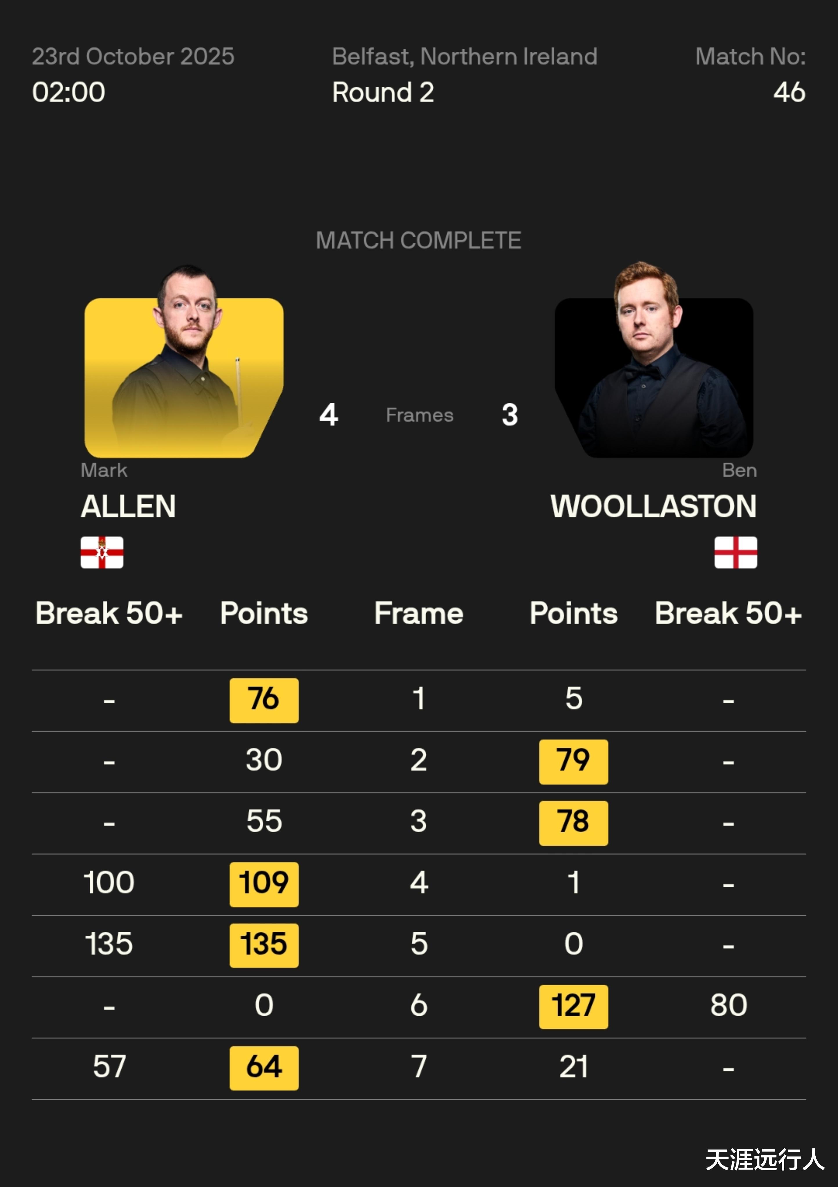 北京时间10月23日凌晨6时43分,2025斯诺克北爱尔兰公开赛正赛第四比赛日,32进16轮次后半程的11场角逐,全部决出了胜负,赛会16强悉数产生。