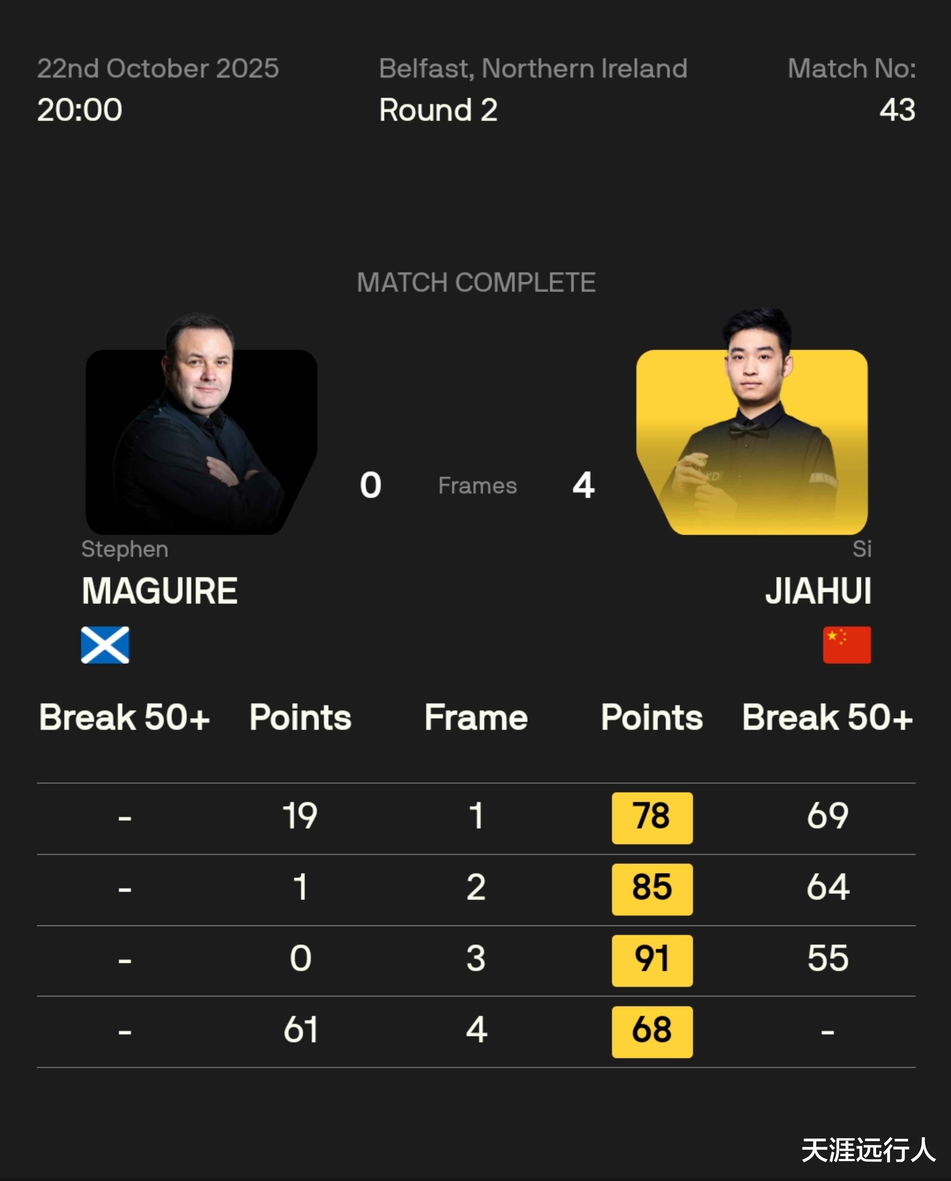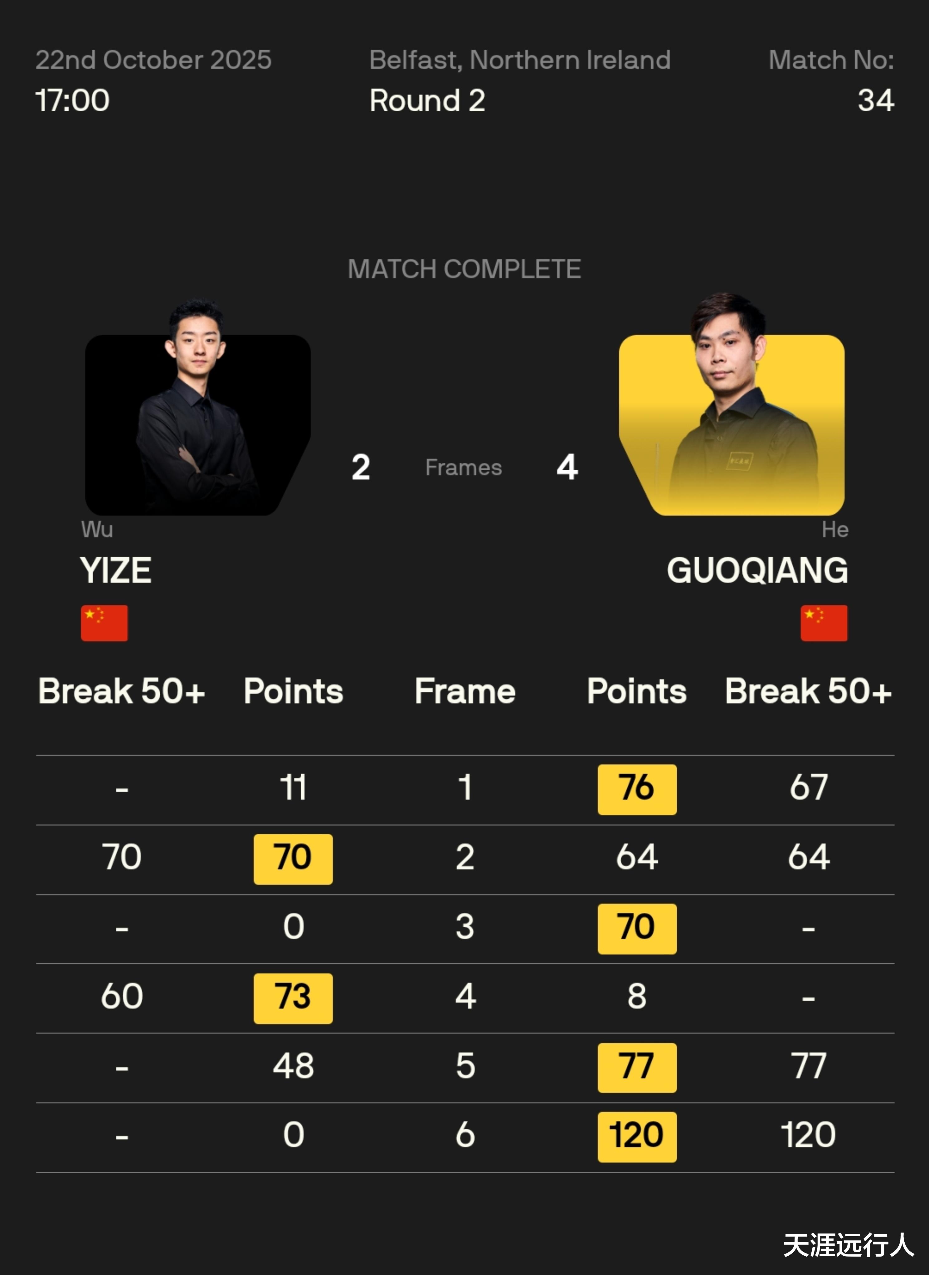 中国军团共4位球员出战当日该轮次的争夺,一场德比,两场外战,最大限度取得三胜,国强、斯佳辉、周跃龙三人过关;进入32强的七位中国球员,算上前一个比赛日德比获胜的袁思俊,四人挺进16强,总体来说表现不错。只是吴宜泽输掉德比,本赛季还没成世冠,也害上了新科世冠的病,七站排名赛,仅有一次打进16强,跟上赛季的表现也是大相径庭。