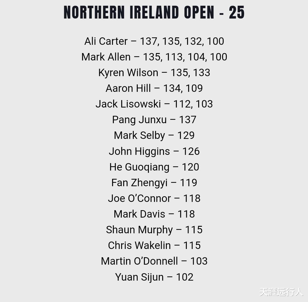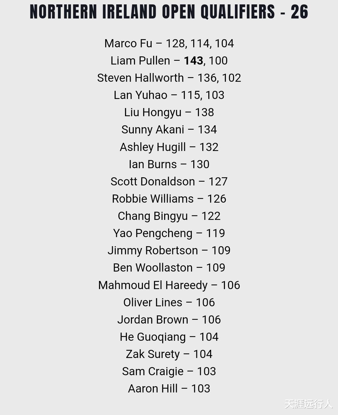 算上资格赛阶段打出的26杆,本届赛会已打出51杆破百,小将利亚姆.普伦的单杆143,暂列赛会的单杆最高分。