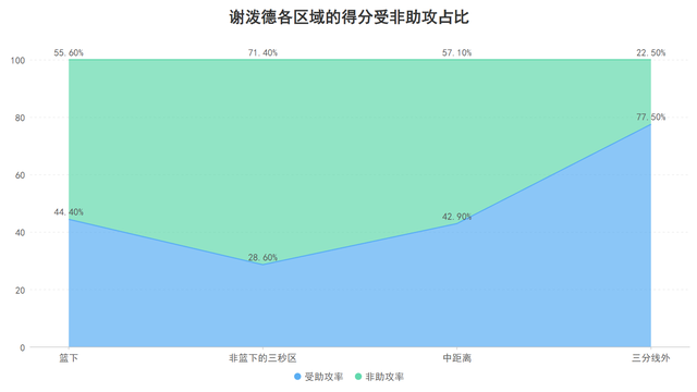 这一点从各区域的出手情况也可以得到体现:谢泼德无论是在篮下、非篮下三秒区、中距离还是三分线外,他各个区域的受助攻与非助攻得分均占有一定的比重,这意味着他无论在哪个区域都有接队友传球直接出手与自主持球单打出手的能力。