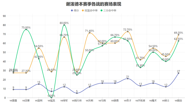 除此之外谢泼德还有两个难能可贵的点,其一是稳定。本赛季他除了赛季初期时神时鬼外,近八战的得分数与两项命中率均达到了稳定的状态:单场50%左右命中率贡献15分左右甚至更高,三分球最差的一战也有33.3%的命中率,稳定的贡献在火箭队内显然是大于神鬼莫测的。
