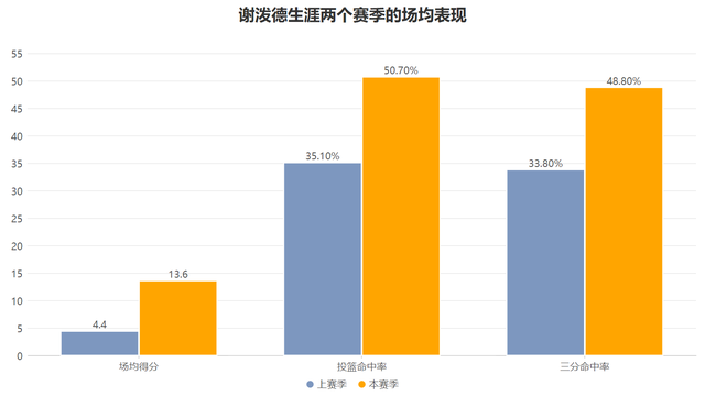 本赛季只是谢泼德的第二个赛季,而本赛季的场均得分从4.4分提升到了13.6分,两项命中率均对比上赛季也均有了质的飞跃,即使在天赋满满的火箭队内他也是极其优异的,这一点不仅仅体现在得分方面: