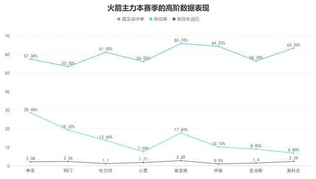 谢泼德的场均13.6分仅位于第五多,但他结合三分以及罚球情况的真实命中率达到了65.7%,这个得分效率位于火箭场均出场20分钟以上8名主力的最高,同时他17.6%主力第三的助攻率意味着当他在场时,队友有17.6%的得分来自于他的助攻,他在得分效率最高的同时他还有相对不错的助攻表现,并且2.69的助攻失误比也高居主力第一,本赛季的他除了得分产量还没有充分证明外其余的进攻表现已然是优秀级别。