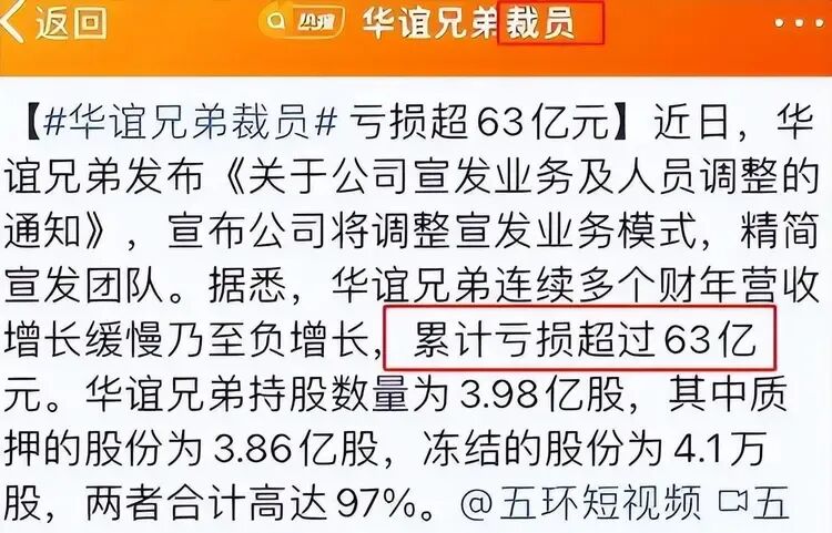 结果 2018 年税务风波一来,紧接着又是影视寒冬、疫情,影院停摆、拍摄延期,华谊的收入从 2017 年的 33.74 亿,直接跌到 2024 年的 4.43 亿,相当于砍了九成。债务窟窿越滚越大,公司账户被冻结,还老被人起诉,王中磊 2023 年就有 1.38 亿待执行金额,到 2025 年兄弟俩加起来欠了 2.8 亿,被限高也是早晚的事。