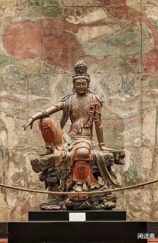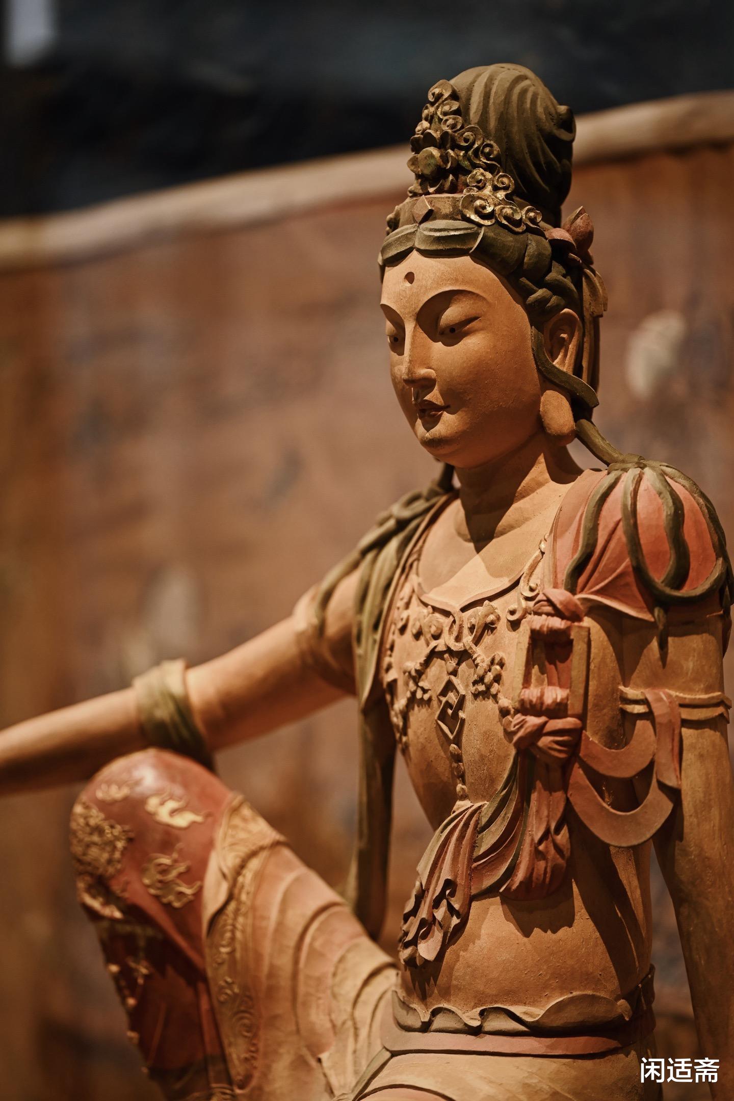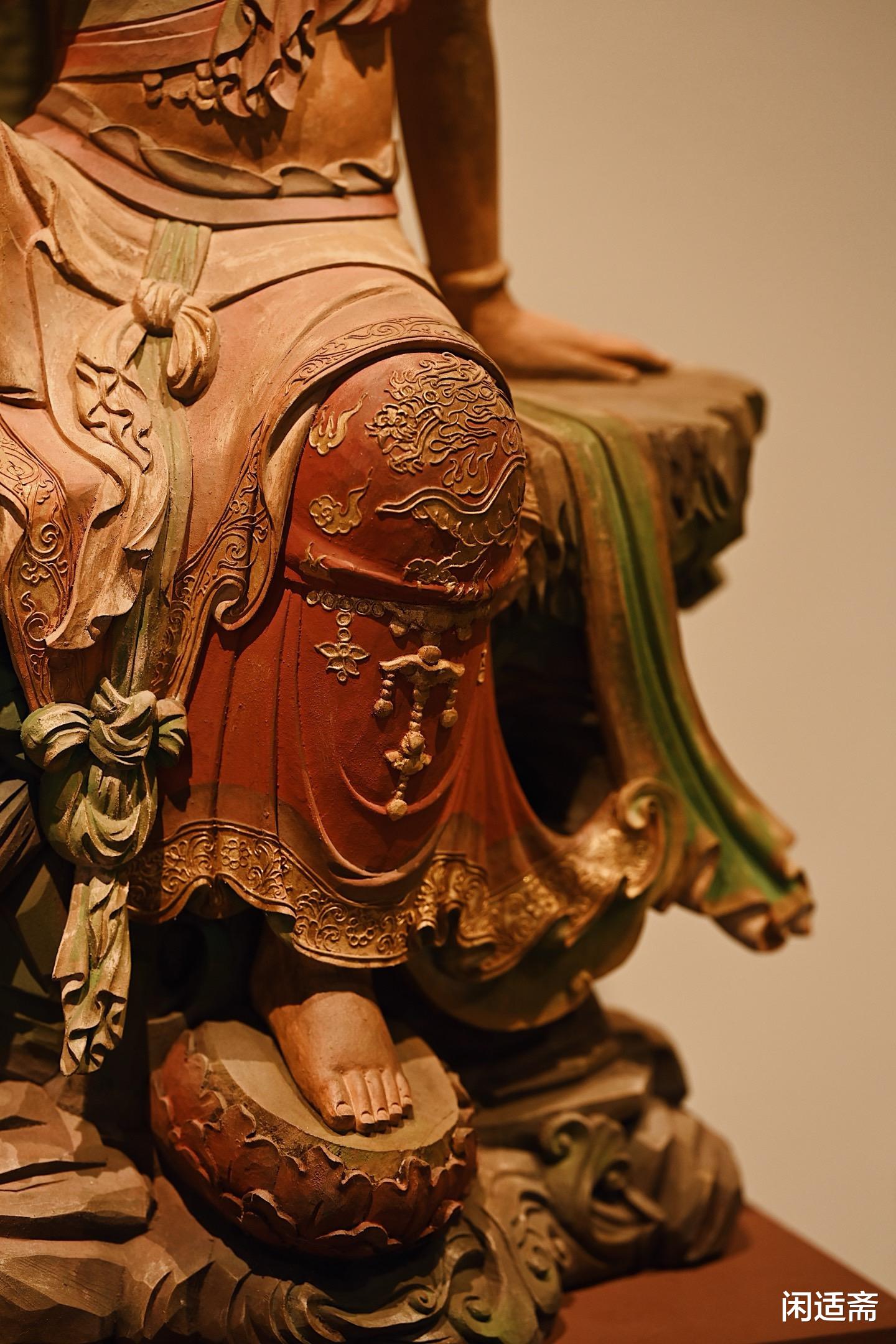 观音的肢体动作与服饰细节,更是延续了馆藏款 “静穆恬淡” 与 “灵动自如” 的平衡感:右手自然垂搭于右膝之上,手指姿态舒展柔和,似轻触衣料,又似欲拂去膝上微尘;左手倚靠于台座,手臂线条圆润流畅,尽显体态的松弛感。上身袒露处肌肤以彩绘勾勒出细腻质感,佩戴的璎珞与腕钏纹饰精致 —— 璎珞由多颗 “宝珠” 串联而成,颗颗饱满立体,色彩从金黄到赤红渐变,复刻出馆藏款中珠宝的光泽;腕钏环绕手腕,花纹以缠枝莲纹为主,线条缠绕交错,与璎珞形成纹饰呼应。肩披的帔帛与下身衣裙衣纹繁缛却不杂乱,线条顺着身体曲线自然垂落,或堆叠于膝间,或垂坠于台座,通过彩绘深浅变化,还原馆藏款中衣物的褶皱与垂坠感,仿佛下一秒便会随微风轻轻摆动,让造像多了几分 “衣袂翩跹” 的仙气。