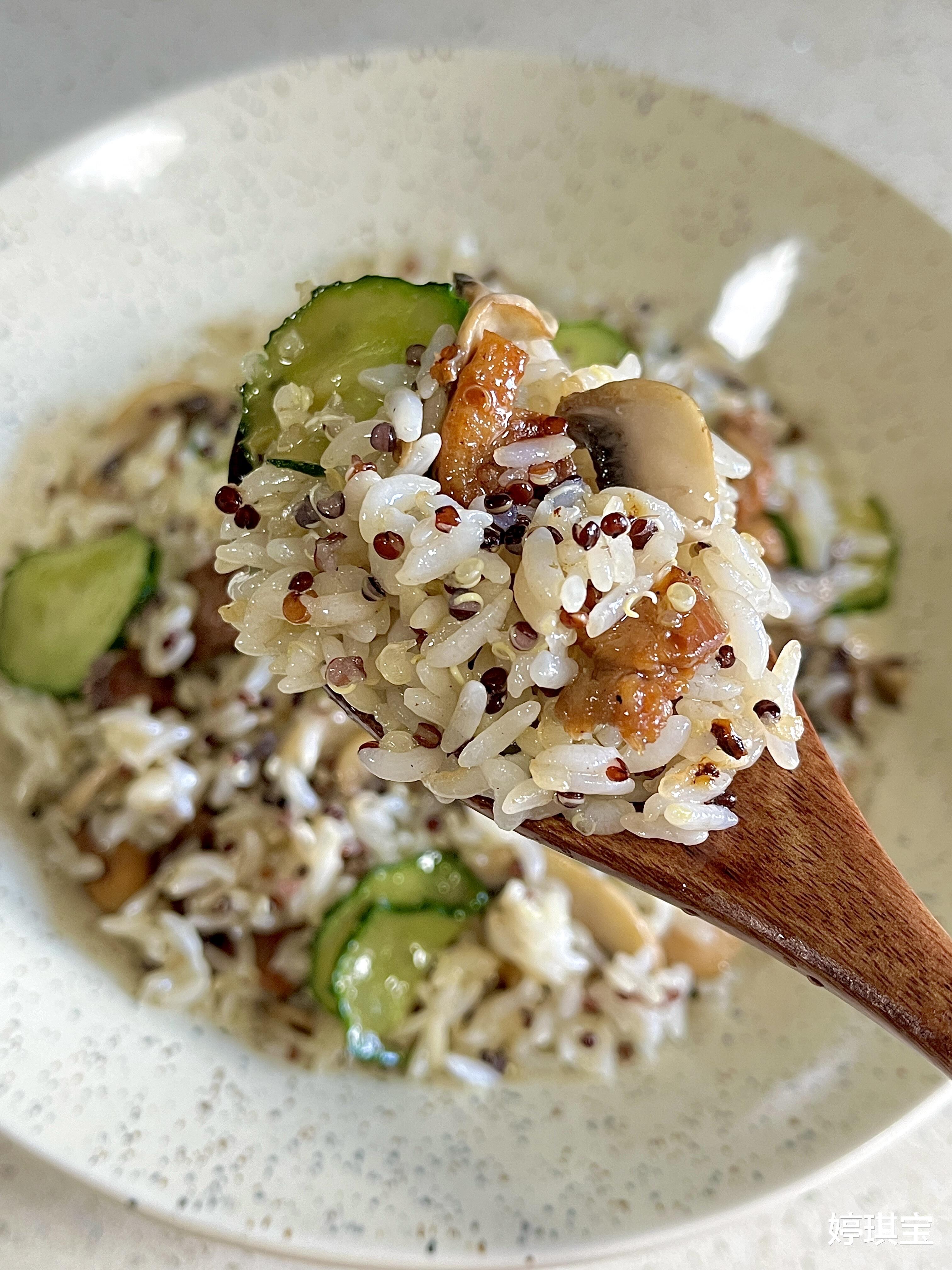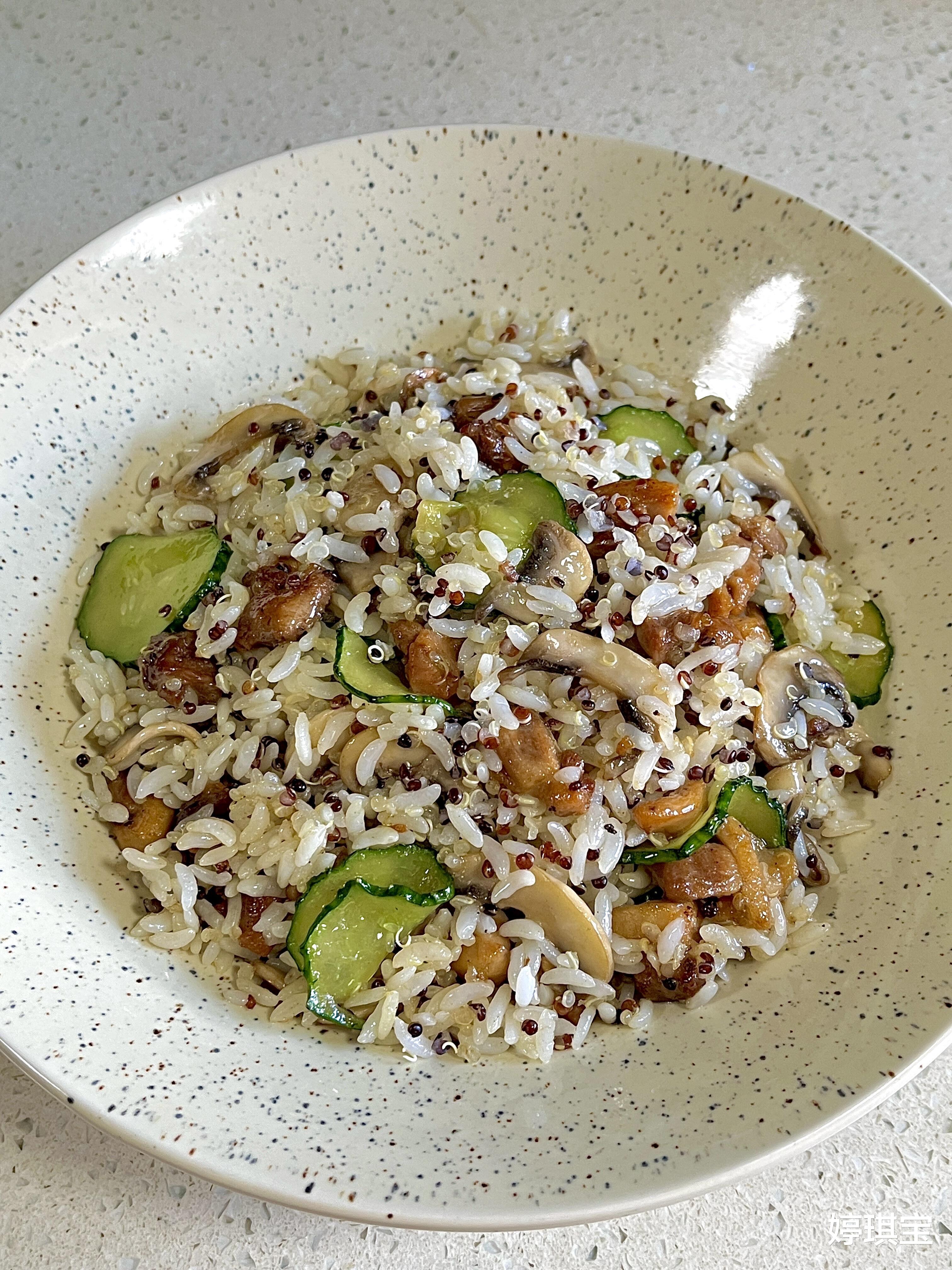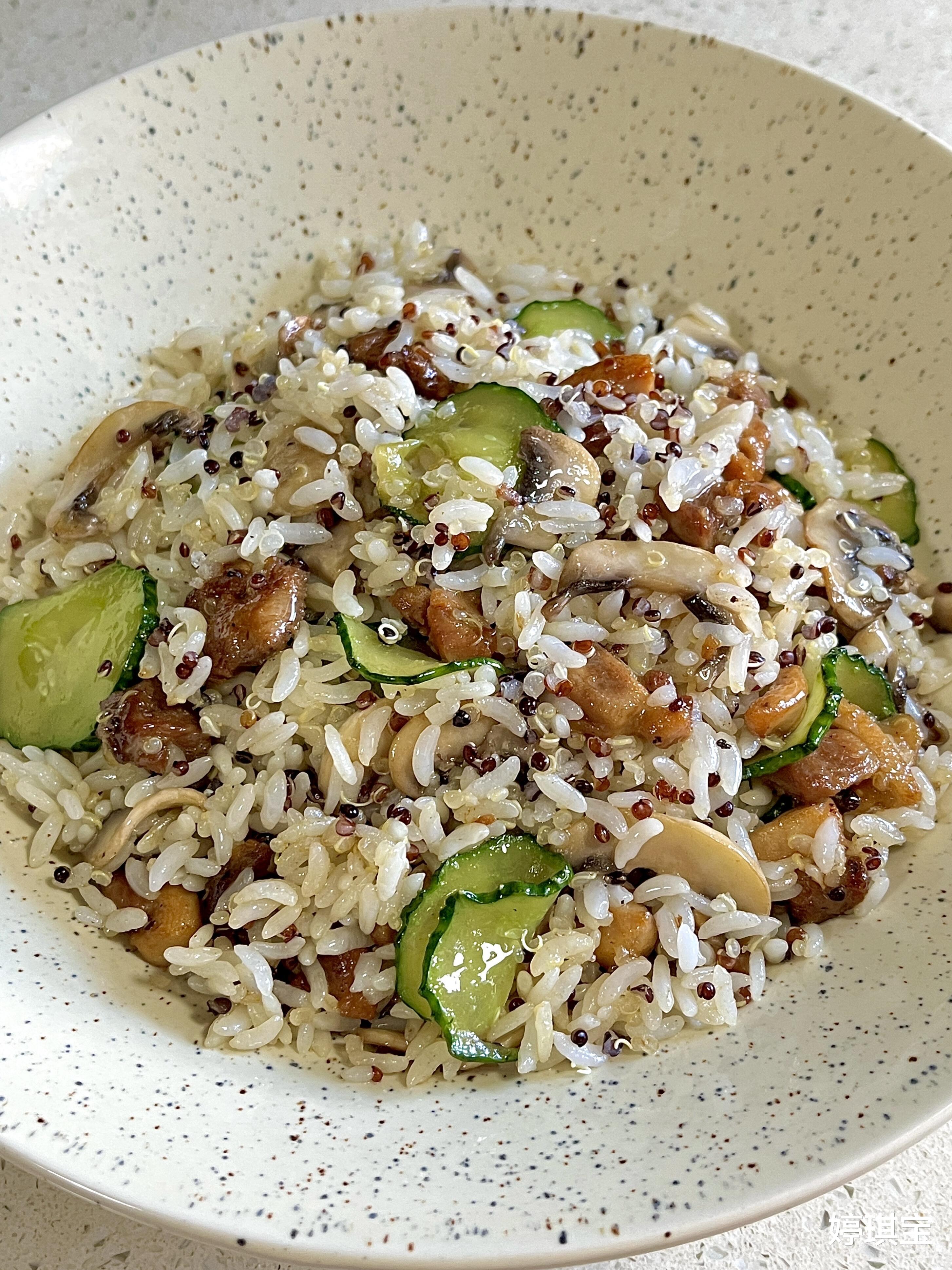 这道炒饭最妙之处在于,既解决了剩饭,又兼顾了营养均衡。鸡肉提供蛋白质,口蘑富含微量元素,黄瓜补充维生素,是一道快手又健康的主食。