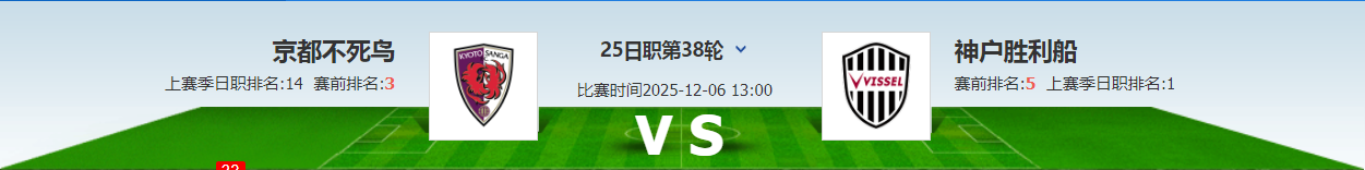 本场比赛是日职联第38轮的一场较量,由主场的京都不死鸟迎战神户胜利。不死鸟目前取得了18胜11平8负的成绩,积65分排在联赛第三位,维持前四名的位置;胜利目前取得了18胜10平9负的成绩,积64分排在联赛第5位,距离前4名1分。本场比赛是联赛的最后一轮,其实也是季军争夺战与亚冠资格生死战。对于主场作战的京都不死鸟而言,目标清晰无比,立足不败,即可将命运牢牢掌握在自己手中。