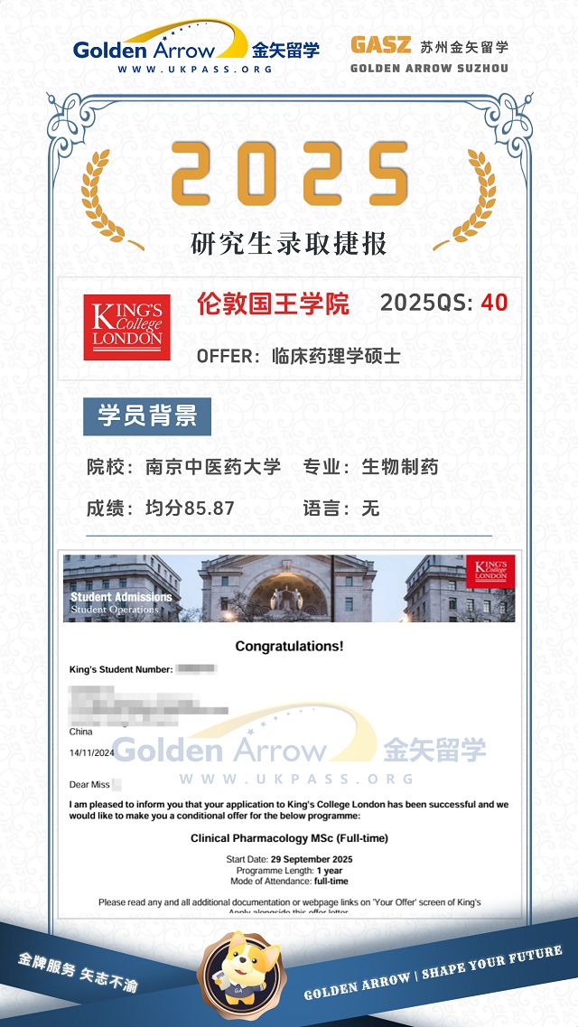 英国大学申请案例:南京中医药大学生物制药专业的同学,以均分85.87及无雅思的背景,通过金矢留学成功申请到了QS世界大学排名第40位的伦敦国王学院的临床药理学硕士,下面一起来看下!