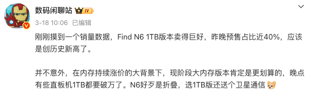 说实话,这种情况在折叠屏里真不多见。以前大家买折叠屏,大多搞个基础版尝个鲜就完事了。结果这次Find N6的16GB+1TB版本,预售占比直接干到快40%,有些平台甚至开始缺货了。