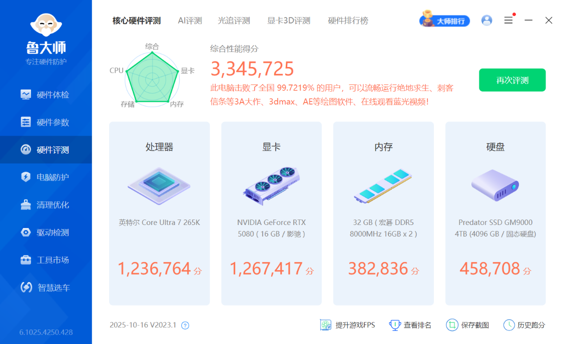 鲁大师整机测试得分334.5W分;