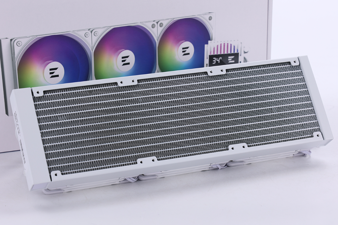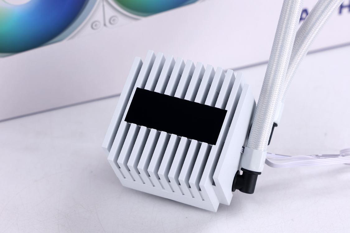 铝合金材质冷排,内置12条微水道,水道之间则内嵌了大量S型散热鳍片,可以提升冷排的散热效率。冷排与冷头之间则通过两根高分子聚合物橡胶材质冷管连接,冷管表面覆盖了严密的编织网套,两端也配备了金属端子进行加固,有效提高了水冷管的耐磨、耐压、耐温性能,让水冷可以保持长时间高效稳定的运行,最大限度降低漏液风险。