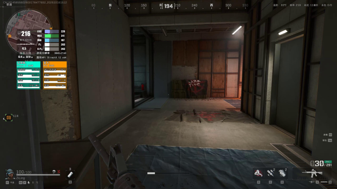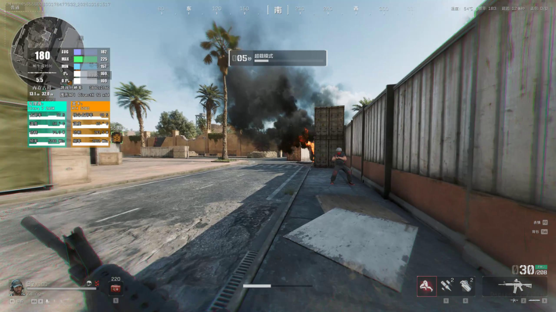 《三角洲行动》游戏中,极高画质,4K分辨率,开启DLSS帧生成,DLSS为性能优先模式时,游戏实际帧数为210FPS左右,在DLSS为质量优先模式时,游戏实际帧数为180FPS左右;