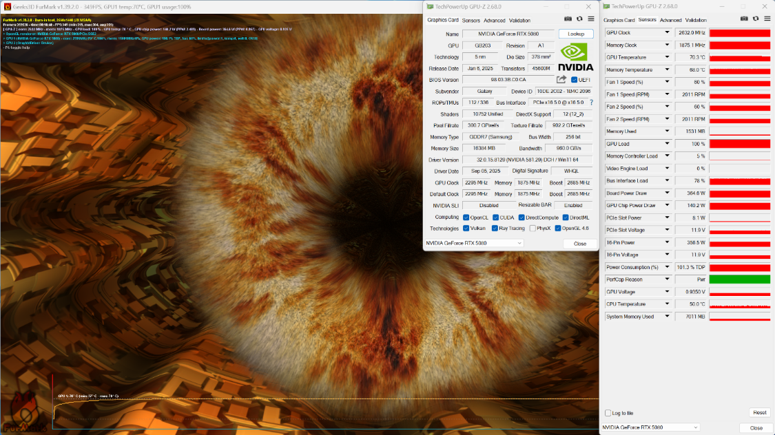 FurMark烤机测试,烤机15 Min后,显卡温度70°左右,显卡功耗360W左右;