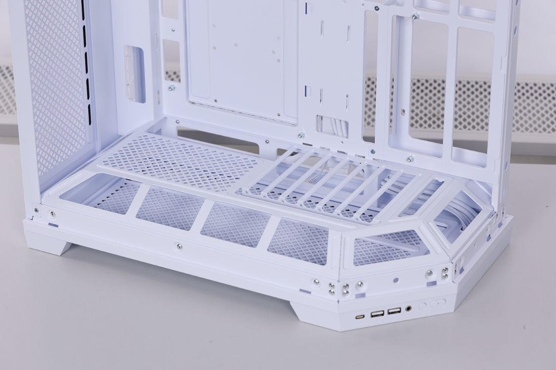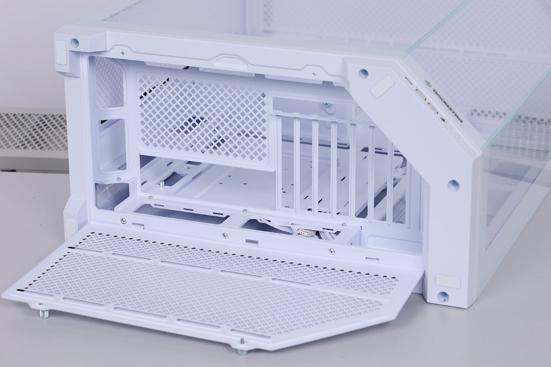 机箱底部有一个特殊的架空结构,主板I/O面板和PCIE插槽都隐藏在这个位置。同时,底部可拆面板还预留了两个风扇位。建议安装风扇的情况下,最好使用弯头视频输出线。