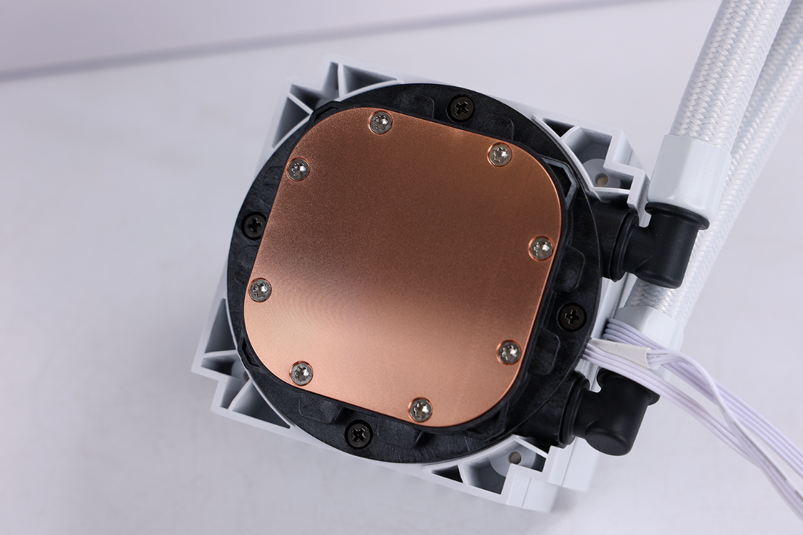 冷头底座是一块大面积纯铜底座,底座内部采用了由微削鳍工艺制成的超精密微水道,搭配冷头内部的创新性水泵设计和最大转速可达3300RPM±10%的高转速马达,可以提供优秀地热交换效率,保证处理器长时高效稳定的运行。