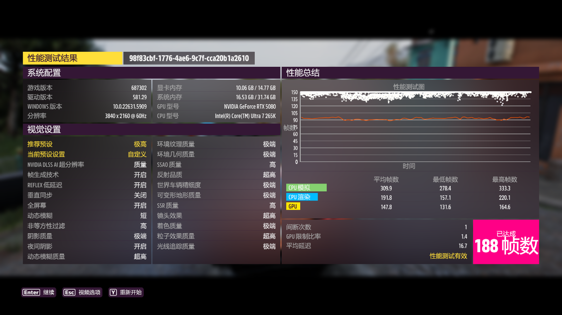 《极限竞速·地平线5》测试,4K分辨率下,极端画质,极端光追,开启DLSS 3.0并设为超高性能模式,游戏平均帧数215 FPS,DLSS为质量模式时,游戏平均帧数188 FPS;