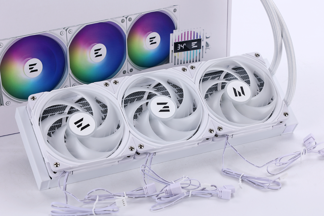 冷排预装了三把12cm高性能风扇,风扇采用PWM 4Pin + 5v3Pin ARGB接线设计,通过配件盒中配备的PWM三合一转接线和5v3Pin接口的一拖一接线设计,连接主板。从而实现风扇转速调节和ARGB可寻址灯效控制。风扇内置了高转速静音马达,最大转速可达2000RPM±10%边框四角则配备上7片鲨鱼鳍扇叶,最大可提供69.12CFM±10%的风量和2.01mmH2O±10%的风压,而满载运行的噪音仅为29.7分贝。