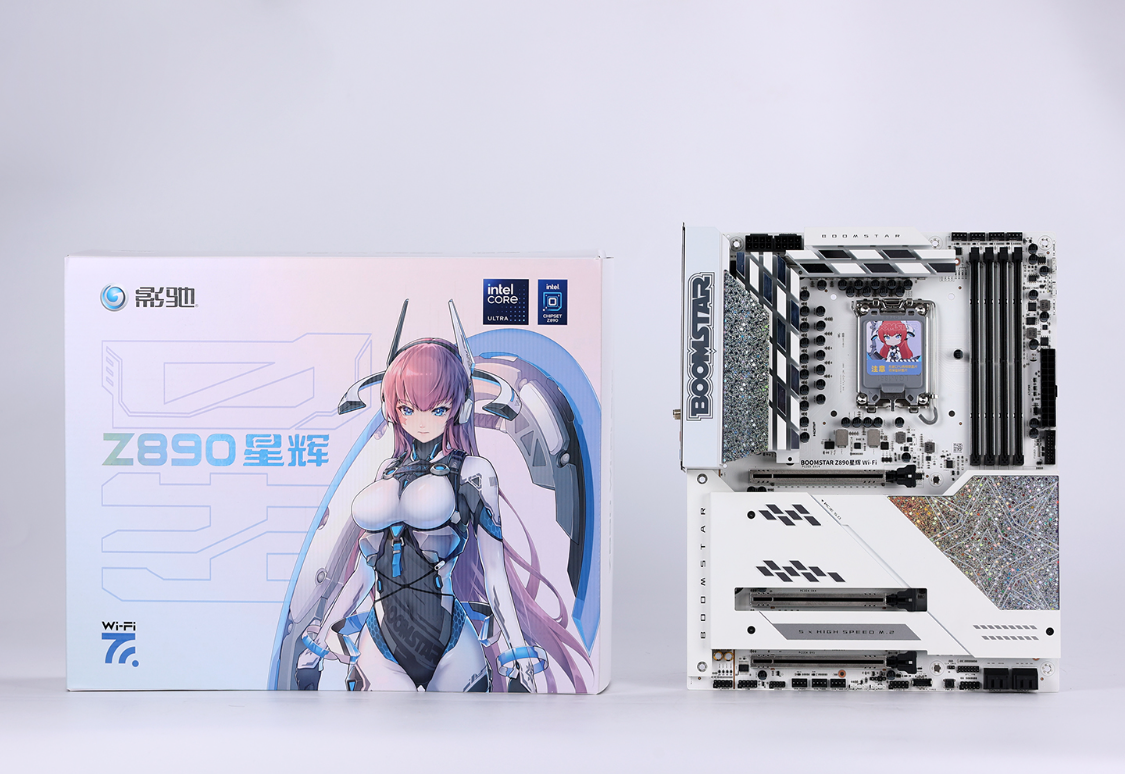 星曜Z890 星辉WIFI主板:全白PCB设计,覆盖在主板表面的大面积白色金属散热装甲,搭配上位于南桥和供电模组散热装甲表面的磁吸式可替换模块以及经过CNC切削工艺处理过的菱形亮面设计,整个主板看起来相当精致。用料方面,主板采用了18+1+1+1相DR.MOS供电设计,4根DDR5内存插槽最高可支持8667MHz+的内存频率,5个M.2固态硬盘位中,除了近CPU侧的接口为PCIe 5.0 x4的速率外,其他4个接口均支持PCIe 4.0 X4的传输速率。