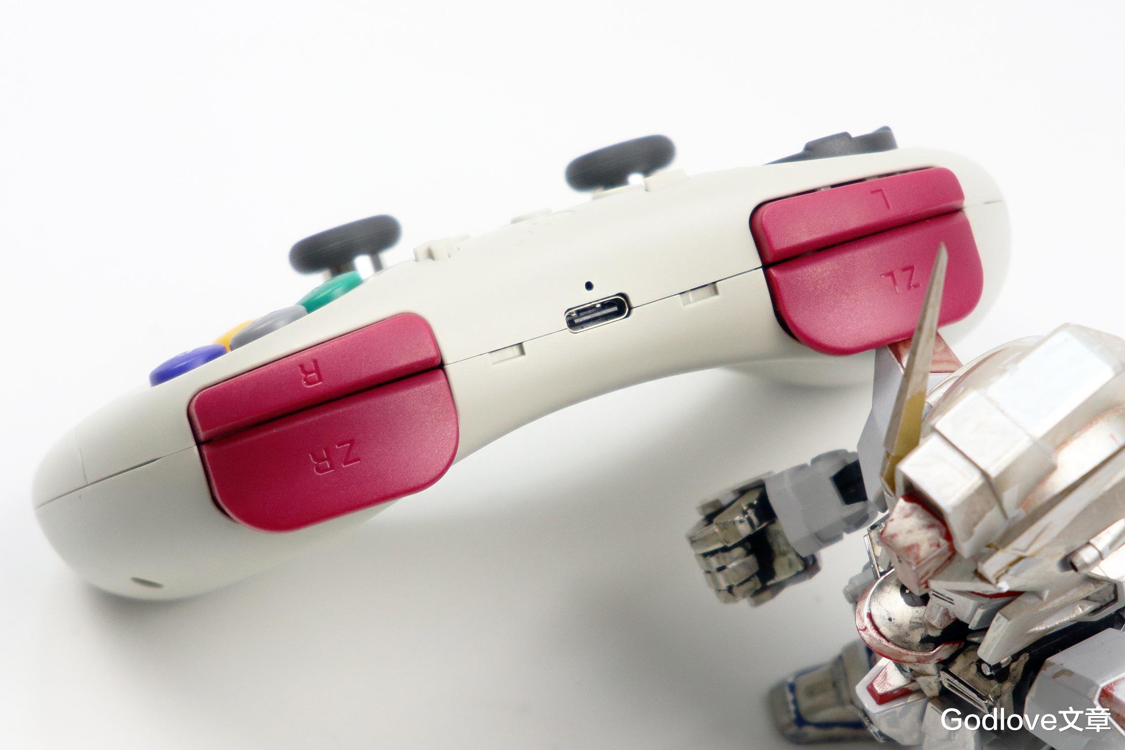 手柄顶部顶部的肩键与扳机同样为暗红色配色,霍尔传感器实现高精度按压。中间位置则是Type-C的充电口和指示灯。