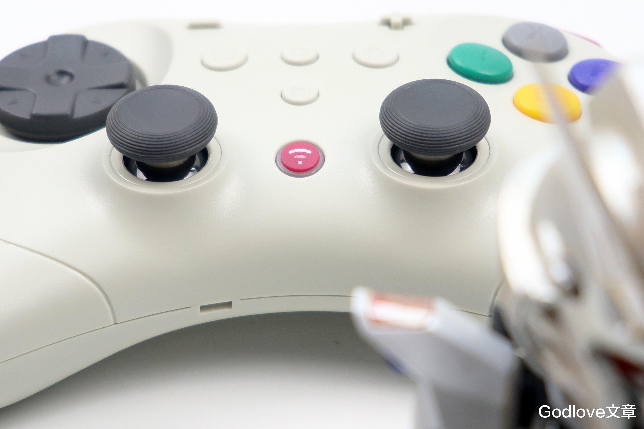 靠下方设置有暗红色的配对按键,周围还有环状的手柄状态指示灯,设计很有新意。