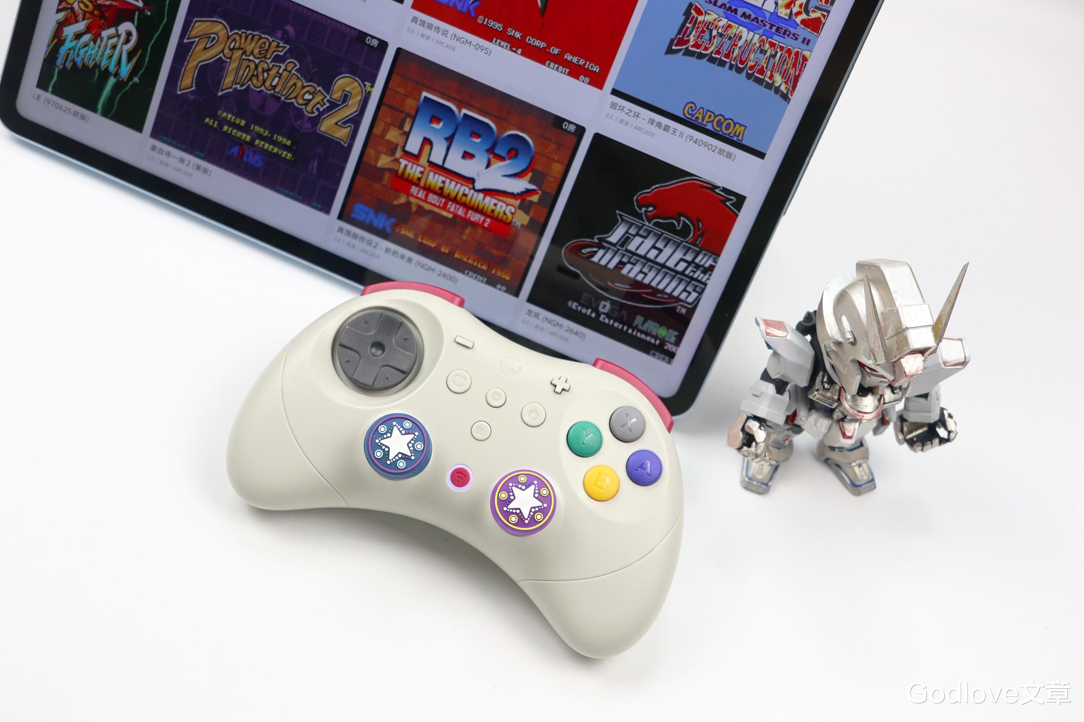 谷粒精灵2Pro手柄整体造型复古,类似世嘉土星的设计给人眼前一亮的设计感,握把位置不像传统手柄设计,传递更宽的握持面。配色方面主体为米白色,点缀以彩色的撞色设计。