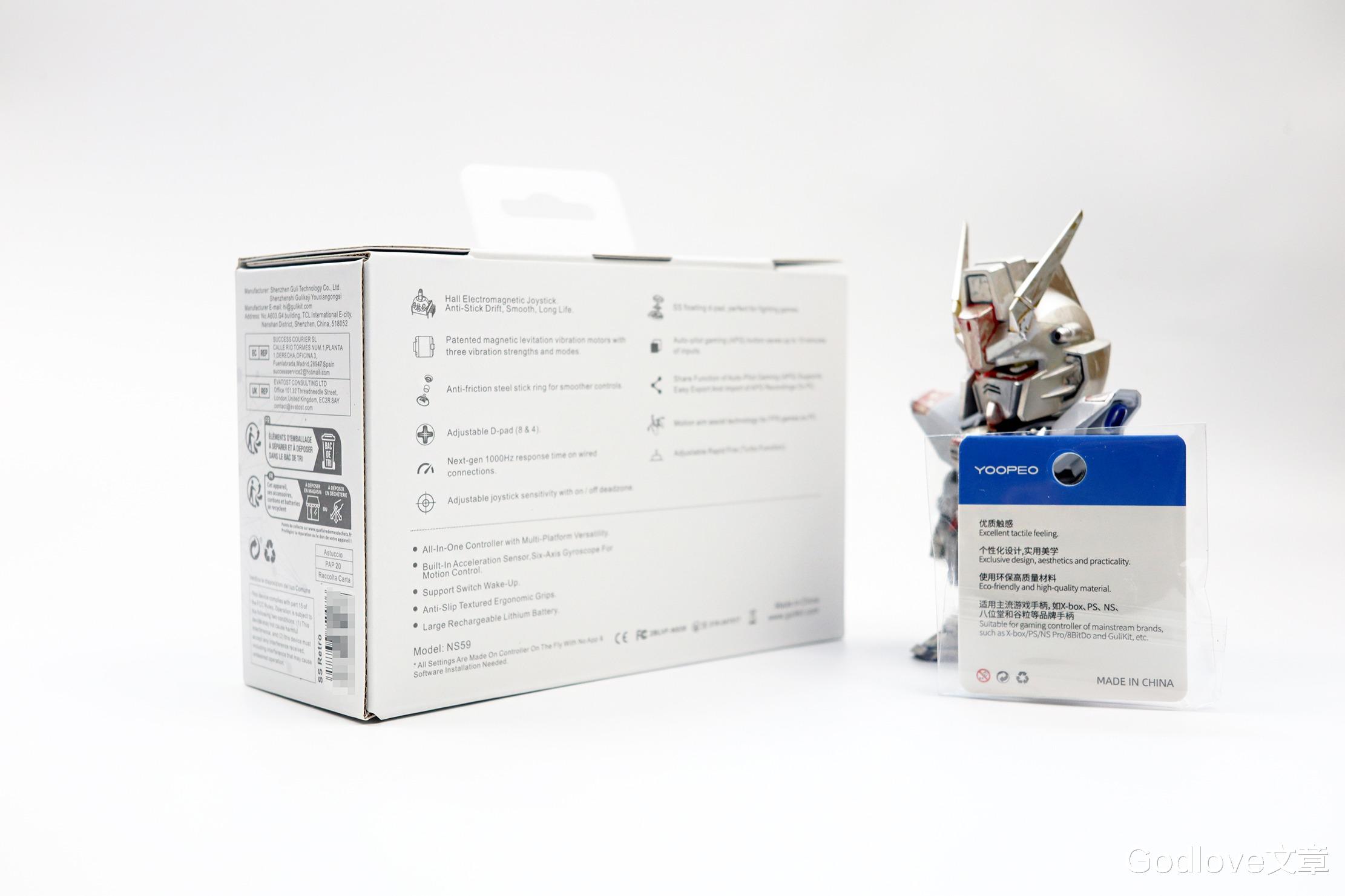 包装盒侧面和背面则详细地展示了谷粒精灵2Pro手柄的11大主打卖点和参数信息,而且采用的均为英文标注可见谷粒很有国外市场的意图。