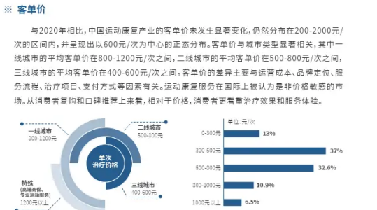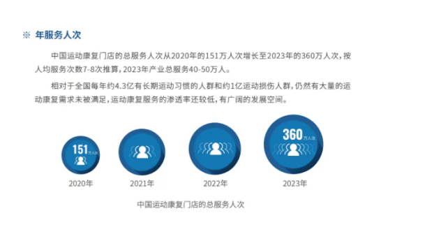 不管是一线城市、还是三线城市,一次几百元起价的客单价其实并不便宜,但运动康复产业的发展前景依然值得期待。运动康复产业联盟调研数据显示,中国运动康复总服务人次从2020年的151万人次增长至2023年的360万人次,按人均服务次数7-8次推算,2023年产业总服务40万到50万人,这一数字相较于全国范围内约1亿的运动损伤者而言,仅触及了冰山一角,运动康复服务在市场中的渗透率仍处于较低水平。可以说未来发展空间广阔。
