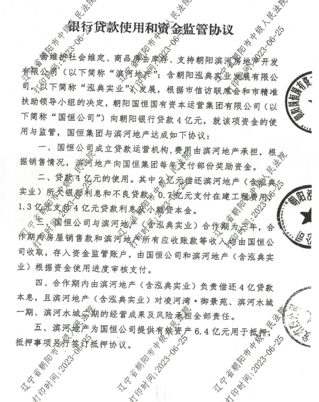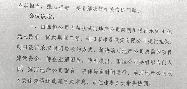 吕积生说,2017年,时任朝阳市信访局长王某,通过朝阳市信访工作联席会议,将滨河地产项目列为当前影响全市信访稳定最为突出的重大疑难信访案件,并向市委市政府汇报。市委市政府高度重视,2017年9月12日,朝阳市召开市信访工作联席会议,会议决定:由朝阳市建设投资有限公司提供担保,由朝阳市国恒国有资本运营集团有限公司(下称国恒公司)向朝阳银行承贷4亿元人民币,帮扶滨河地产复工。
