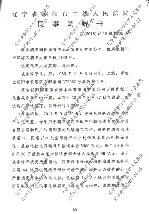 程子良并非借款人,国资帮扶的是滨河地产而不是个人。但在调解书上,将程子良列作被告,并且称程子良为借款人,而程子良对此没提出任意异议。在此案审理期间,朝阳中院就对程子良持有的海翼公司全部股权进行了查封。