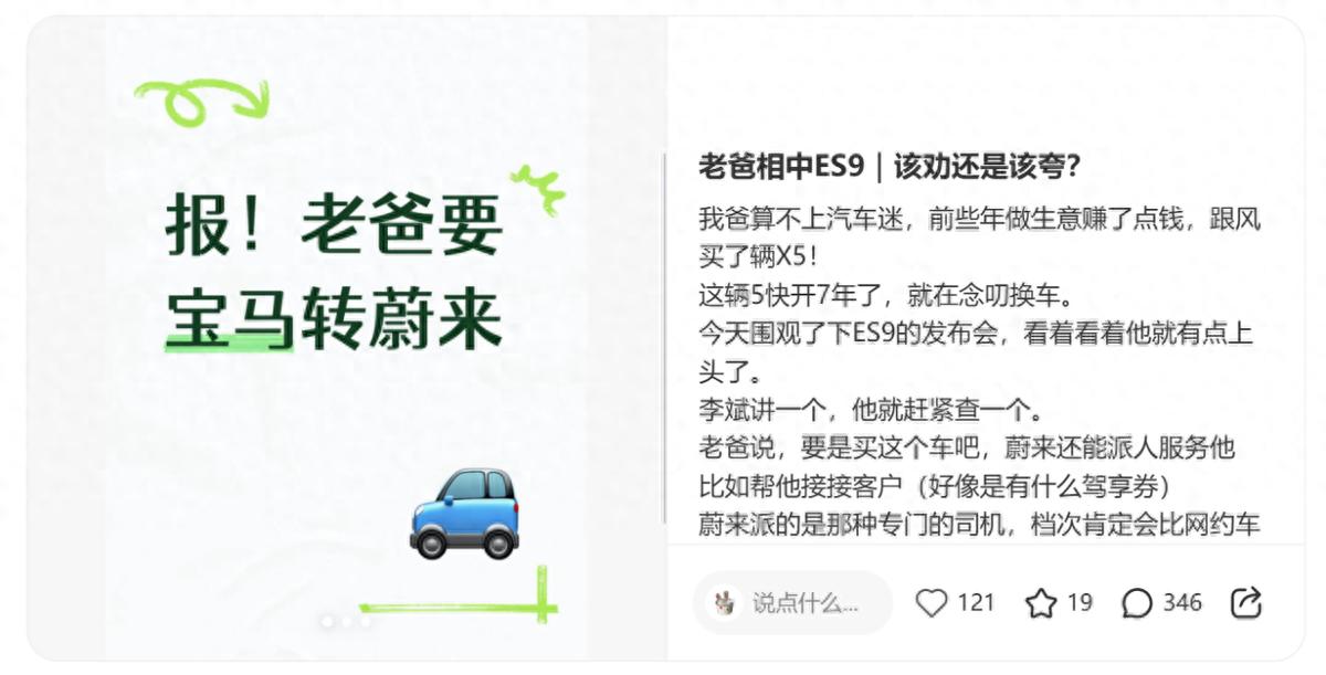 最近,一位网友的发帖,瞬间引爆了车圈热议。帖子中,这位网友的父亲,一位开了近7年宝马X5的传统燃油车主,在围观了蔚来ES9的发布会后,当场“上头”。态度转变之快,让家人都措手不及。