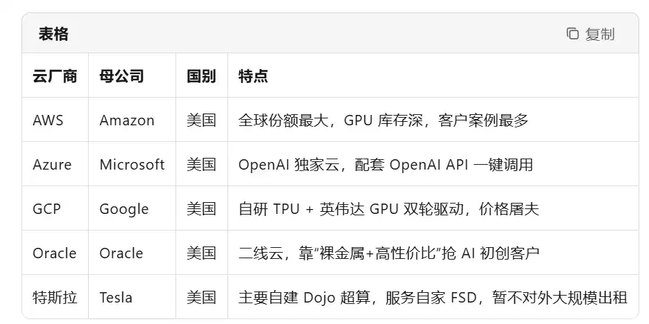 一句话总结:训练/推理算力被“美系四云”垄断,Oracle 和特斯拉是细分/自用搅局者。