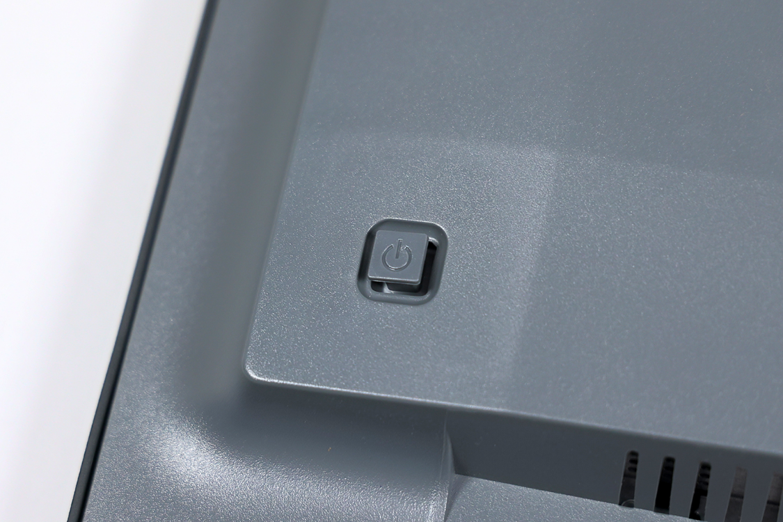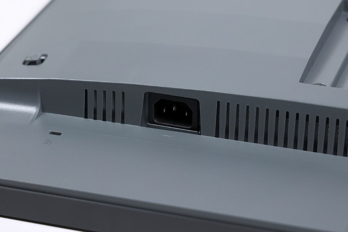 显示器采用电源内置的设计,电源接口位于显示器接口区域的左侧,接口的旁边预留了1个防盗锁扣接口,接口两边则设计了大量格栅状开孔,可以与显示器背部上方的散热缝形成高效的散热风道。