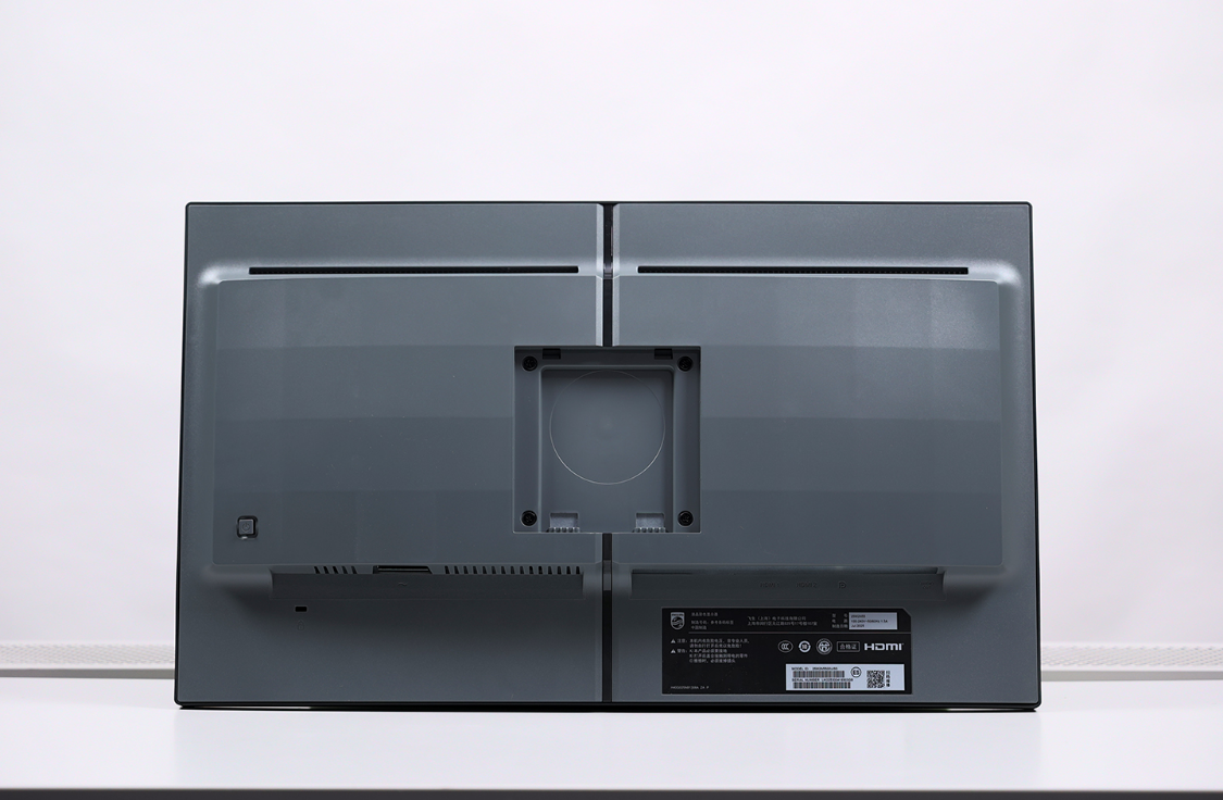 显示器背部中间凸起位置有类机械装甲方块设计,贯穿显示背部的黑色装饰条也和背部上方的显示器散热缝构成了十字状纹路,设计感十足且辨识度高。中间位置为显示器的Vesa支架接口,最大支持安装100*100mm规格的的Vesa支架,支架接口的下方则为显示的电源、信号接口。