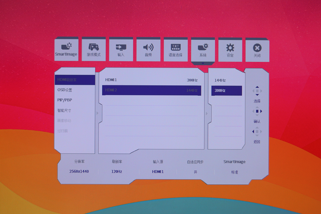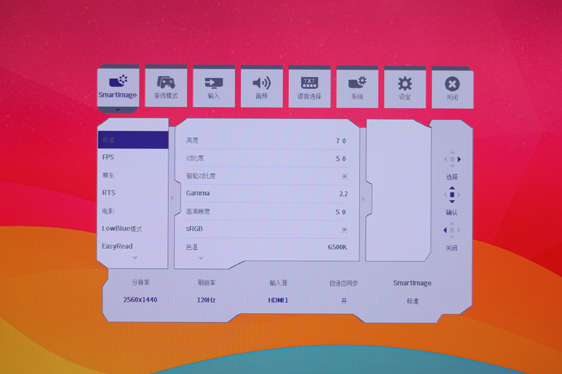 硬件出彩,软件方面同样重要,飞利浦EV弈威25M2N5500U显示器提供了功能丰富的OSD菜单,菜单风格简约,7大功能分类中,玩家可以快速找到需要调整的功能,并对显示器的刷新率、屏幕亮度、对比度、Gamma值、清晰度等设置进行调整。