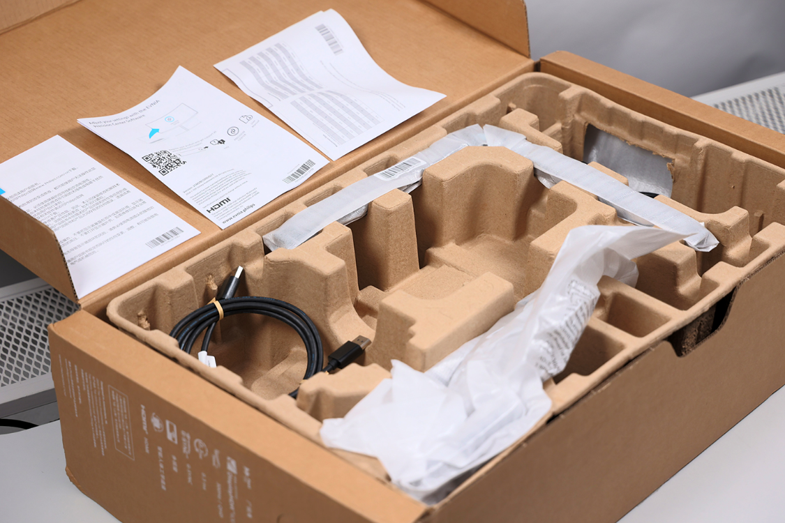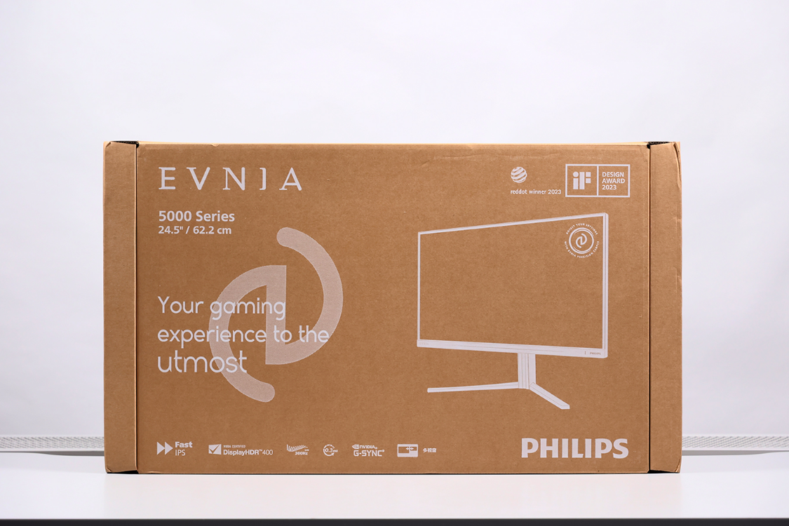 简洁但不失质感的牛皮纸外包装,正面印有显示器本体的线稿渲染图,右上角还有2023年红点设计奖和if 2023设计奖的认证标志,底部则是显示器的一些技术认证标识。