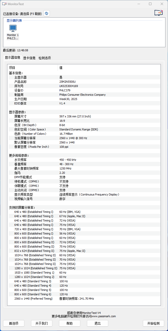 使用MonitorTest对显示器进行检测,可以看到它采用的是一块24.5英寸Fast IPS面板,屏幕最大分辨率为:2560*1440(QHD 2K),像素密度为108ppi,最高刷新率300Hz,屏幕亮度达到了400nits(典型亮度),对比度达到了1300:1。同时,飞利浦EV弈威25M2N5500U还拥有Display的HDR 400高动态解析技术认证,可以展现出十分真实亮丽的屏幕画面。