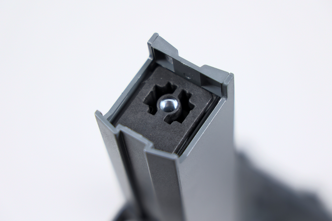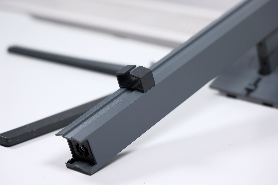 将V型底座支脚上的凸起对准支撑杆部分上预留的卡榫接口,并拧紧底座下方的手拧螺丝即可完成支架组装。