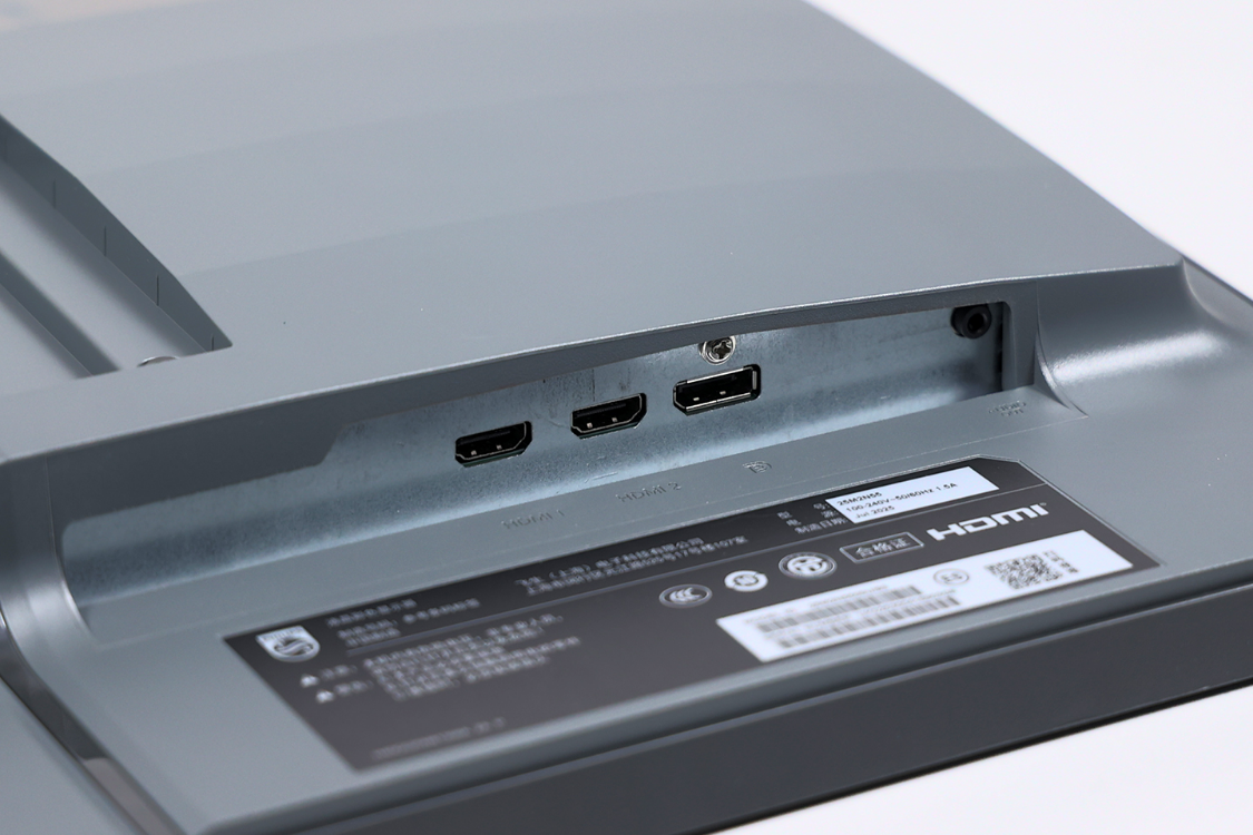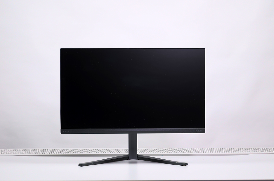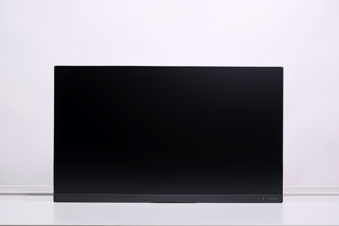 显示器本体采用了太空灰配色,尺寸557*331mm,不到3mm的三面窄边框设计,游戏、观影时的沉浸感会更好。显示器正面底部两端有EVNIA和飞利浦(PHILIPS)的英文LOGO,而在飞利浦LOGO旁边还有白色的电源指示灯。