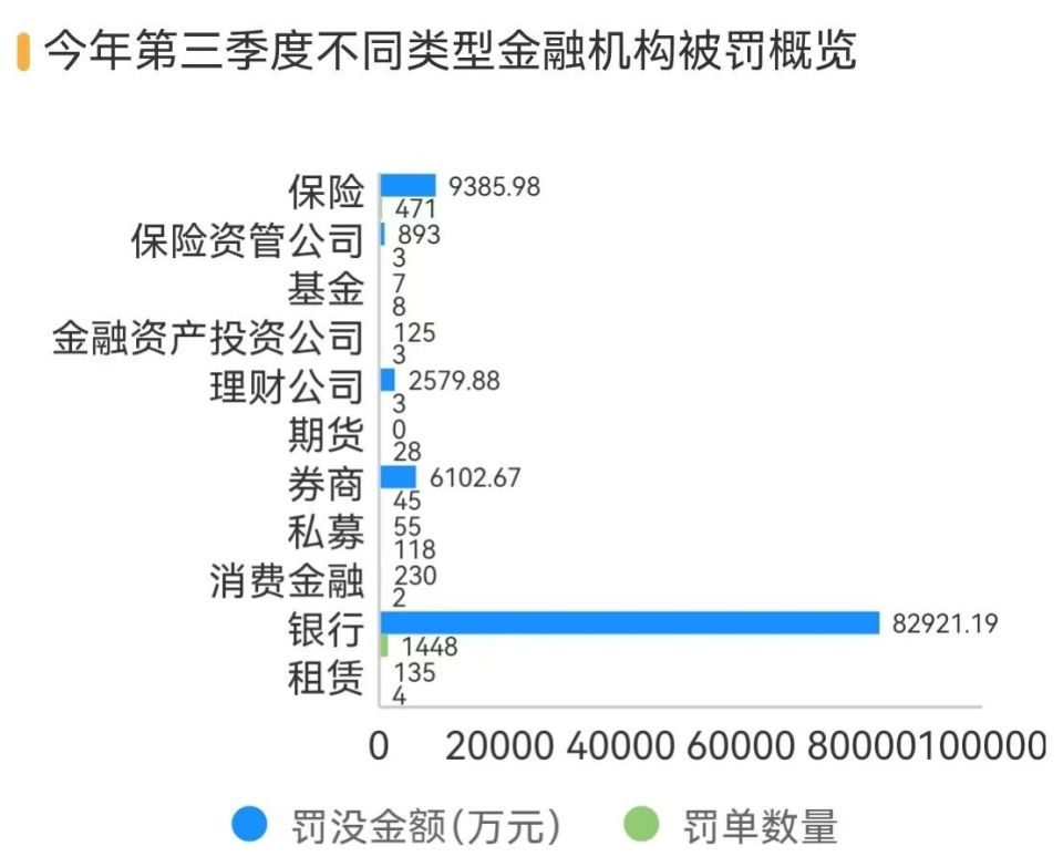 其中银行第三季度收罚单1448张,同比增加18.3%,罚没金额8.29亿元,同比大增84.63%。