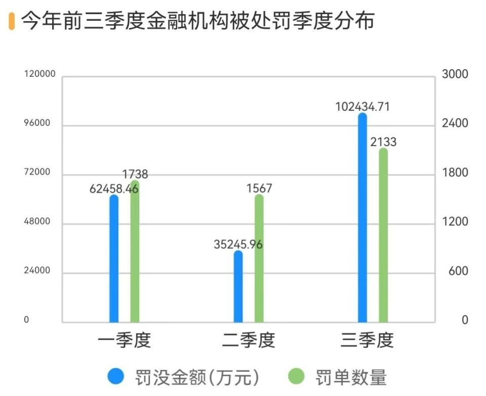 今年第三季度金融机构共收到2133张罚单,罚没金额达10.24亿元,分别环比大增36.12%、190.91%,相比去年同期也明显增加。
